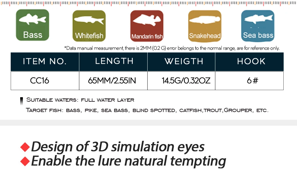 La acción de natación perfecta es mortalmente atractiva para los peces. Este Tipo de señuelo de pesca muestra una acción de natación animada en el agua, con bola de acero en el interior, Los cebos pueden mantenerse estables durante el lanzamiento y pueden aumentar la distancia de lanzamiento al mismo tiempo.