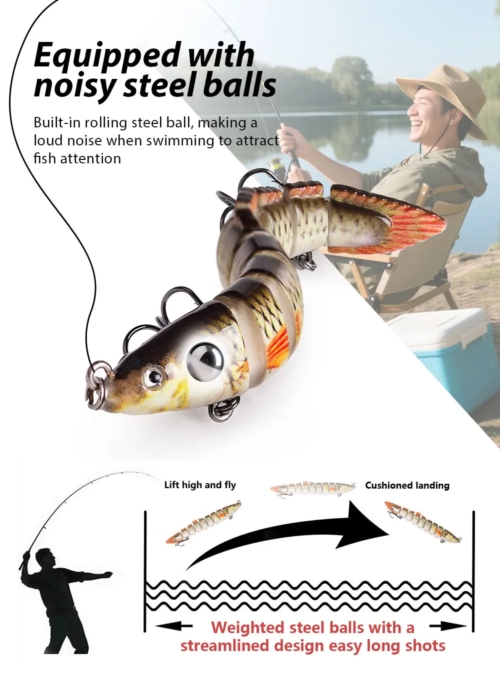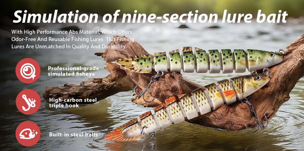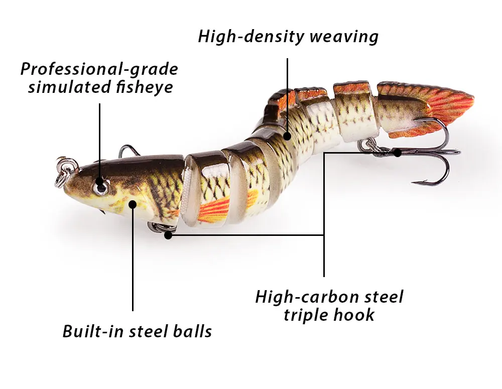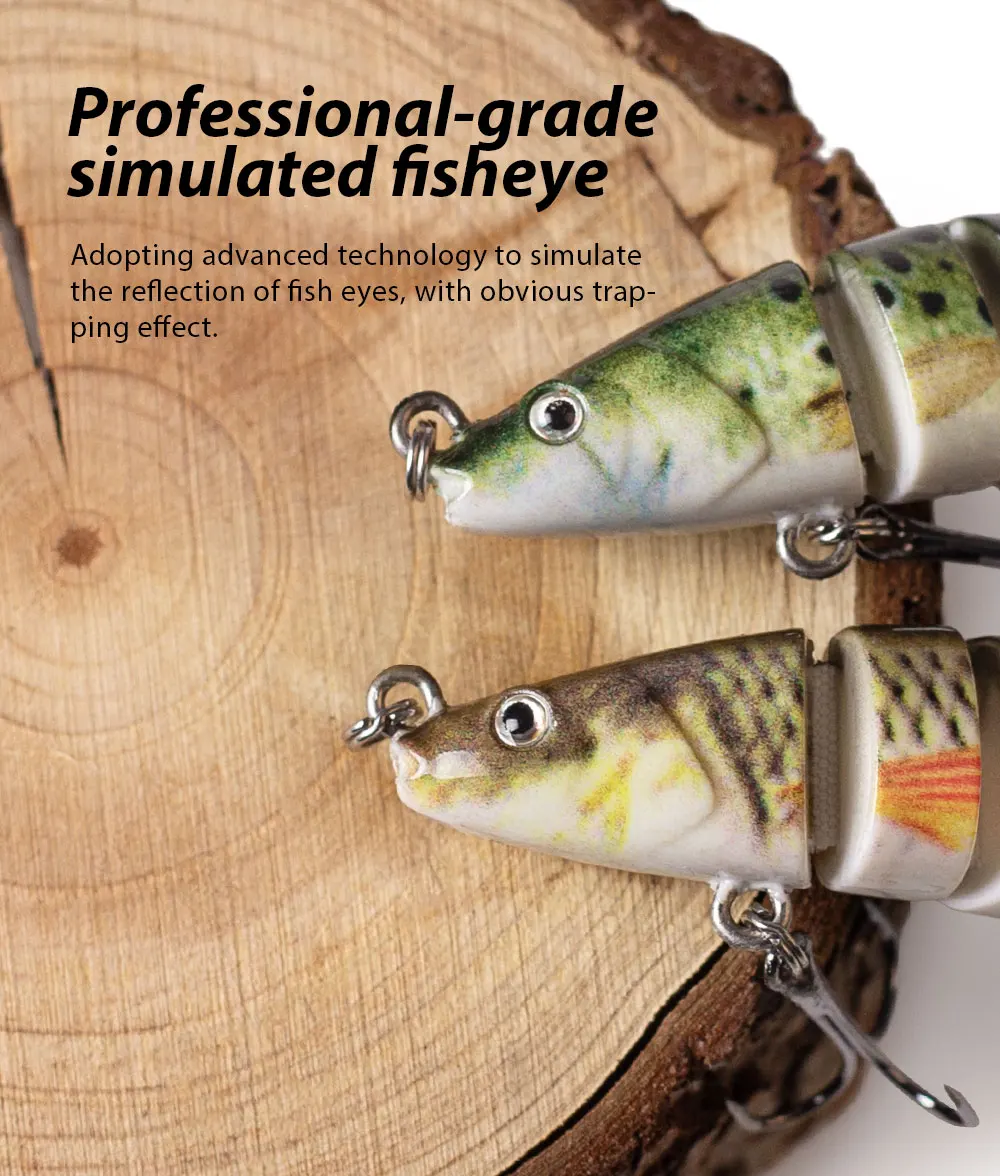 Este cebo duro de Múltiples articulaciones es uno de los mejores accesorios en su caja de aparejos. Tiene una apariencia realista y puede crear acciones de natación realistas en el agua para provocar que el depredador muerda. Si eres un amante de la pesca, coge este señuelo de pesca y aumentará tus capturas y te traerá más diversión.