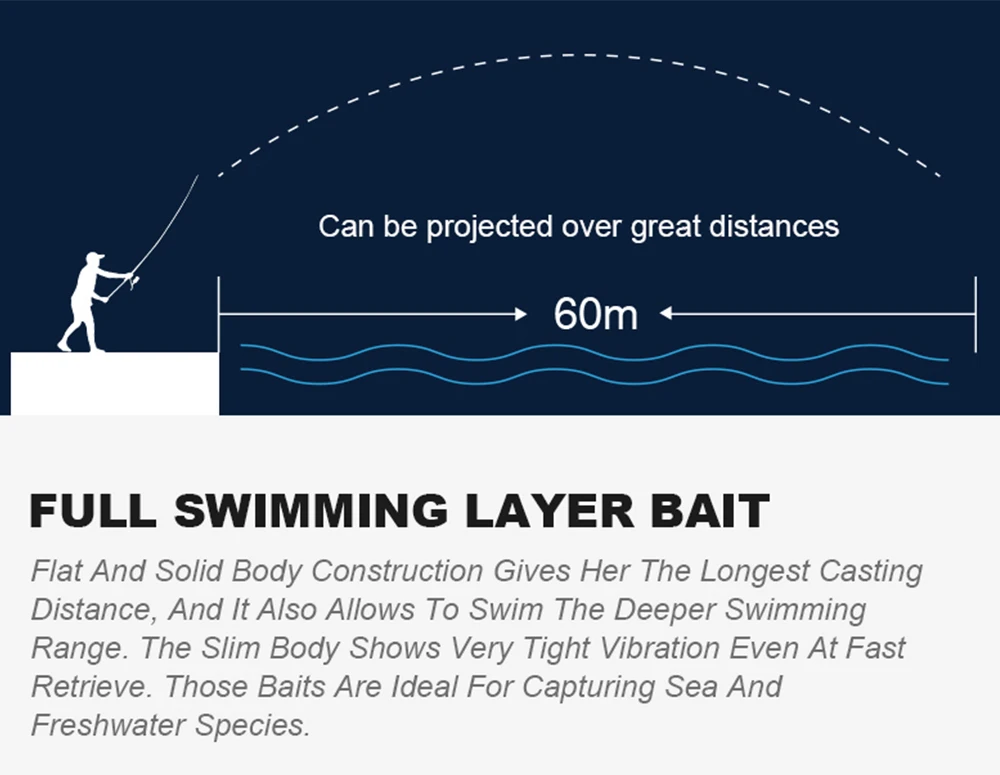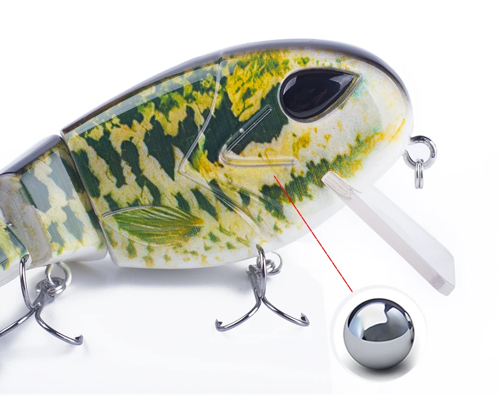 Se ha utilizado una serie de tecnología avanzada durante la producción, deja que este crankbait realista tenga las siguientes funciones y también te brinde una experiencia más agradable en tu viaje de pesca.La acción de natación perfecta es mortalmente atractiva para los peces. Este Tipo de señuelo de pesca muestra una acción de natación animada en el agua, con bola de acero en el interior, Los cebos pueden mantenerse estables durante el lanzamiento y pueden aumentar la distancia de lanzamiento al mismo tiempo.Las pequeñas bolas de acero pueden hacer sonidos que atraerán fuertemente la atención de los peces Cuando arrastre el cebo.Además, las bolas de acero internas se miden con un instrumento de precisión, que puede ajustar la carrera de natación de los cebos al máximo. Los súper materiales son extremadamente fuertes y duraderos, le permiten usar señuelos más largos que los normales.