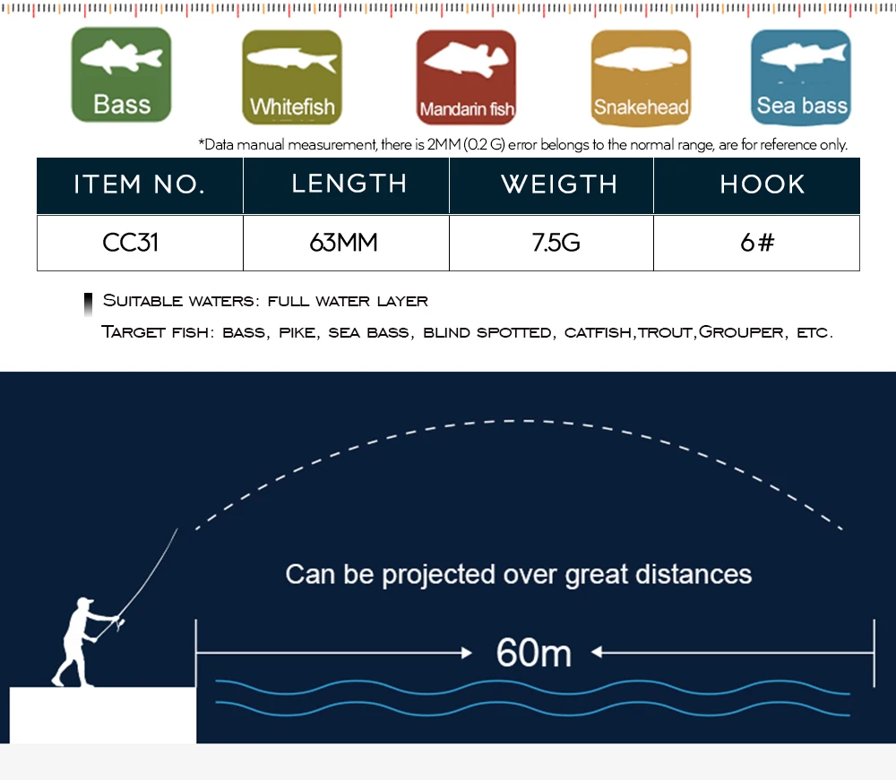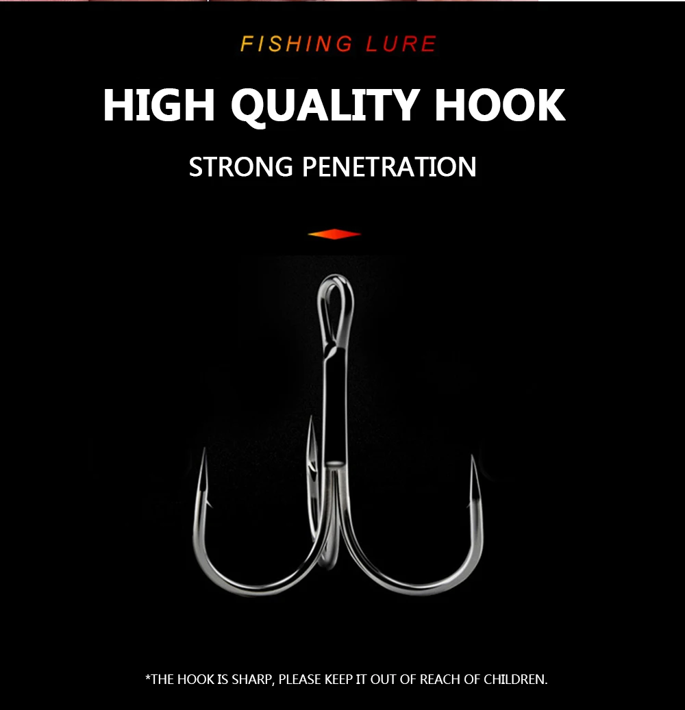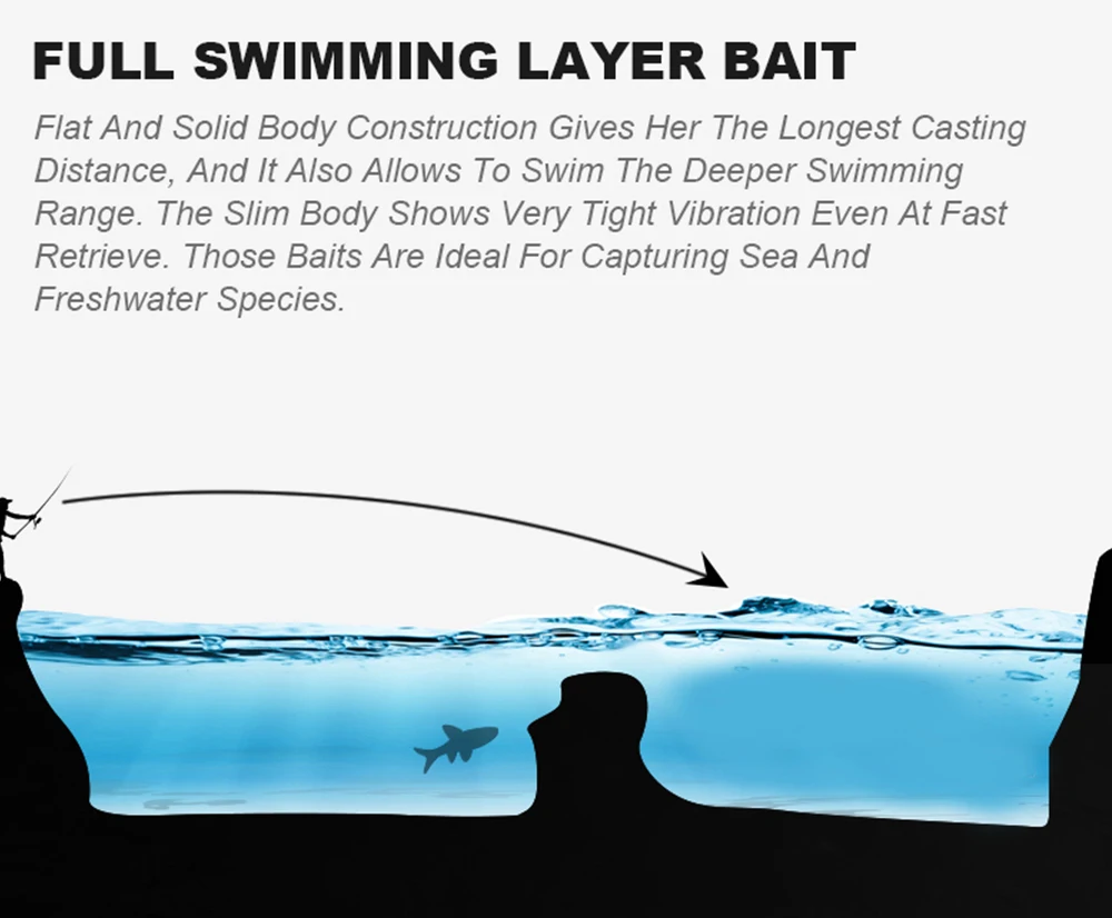 La acción de natación perfecta es mortalmente atractiva para los peces. Este Tipo de señuelo de pesca muestra una acción de natación animada en el agua, con bola de acero en el interior, Los cebos pueden mantenerse estables durante el lanzamiento y pueden aumentar la distancia de lanzamiento al mismo tiempo.