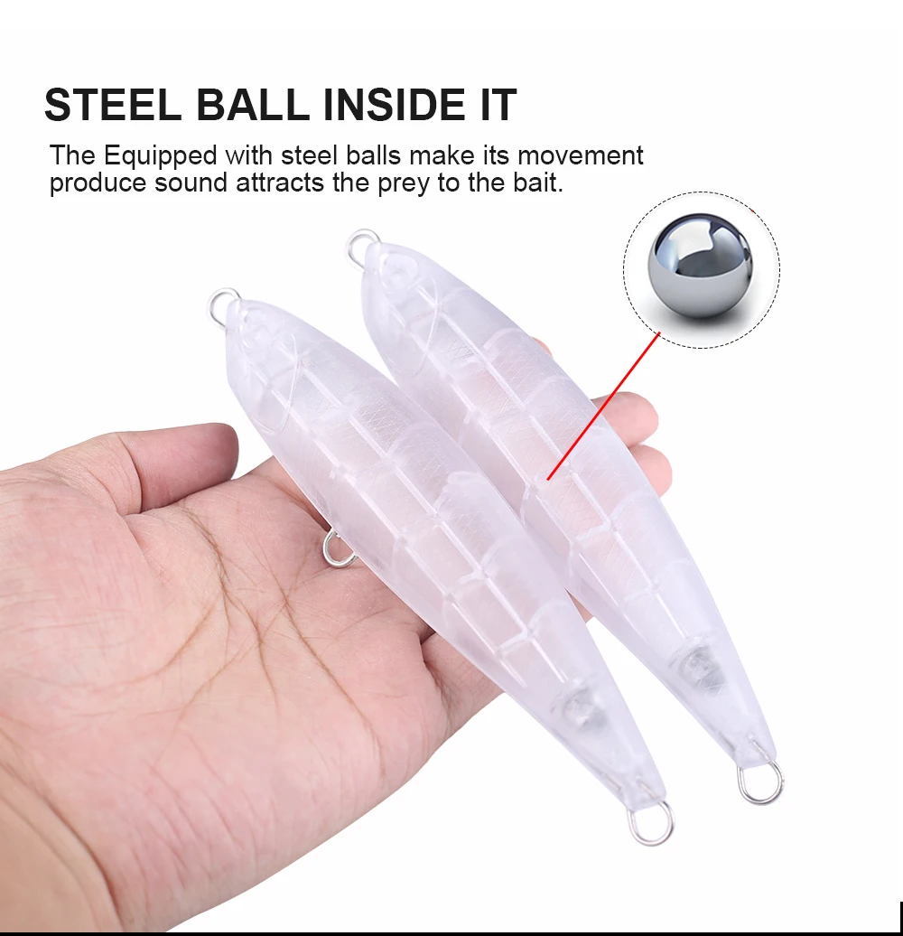 La acción de natación perfecta es mortalmente atractiva para los peces. Este Tipo de señuelo de pesca muestra una acción de natación animada en el agua, con bola de acero en el interior, Los cebos pueden mantenerse estables durante el lanzamiento y pueden aumentar la distancia de lanzamiento al mismo tiempo.