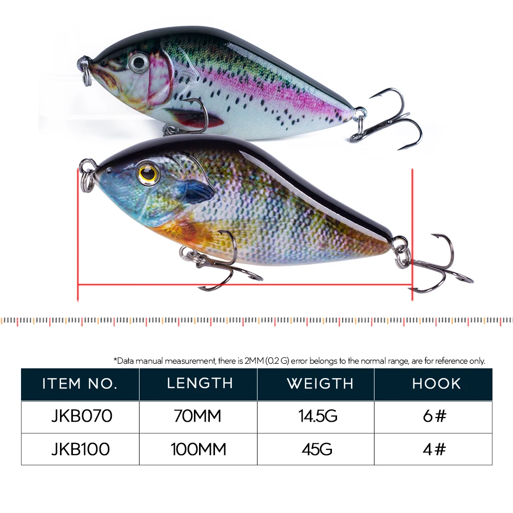 3) Estructura general: la estructura interna utiliza la bola de acero para equilibrar la conducción. Cuando Tomas la línea, la bola en el cuerpo se transmite a otras partes y produce sonido, lo que puede llevar al pez a perseguir. La forma está hecha de acero al carbono con 2 anzuelos triples súper afilados para garantizar que los peces no se escapen. Esos jerkbaits son ideales para capturar especies marinas y de agua dulce.
