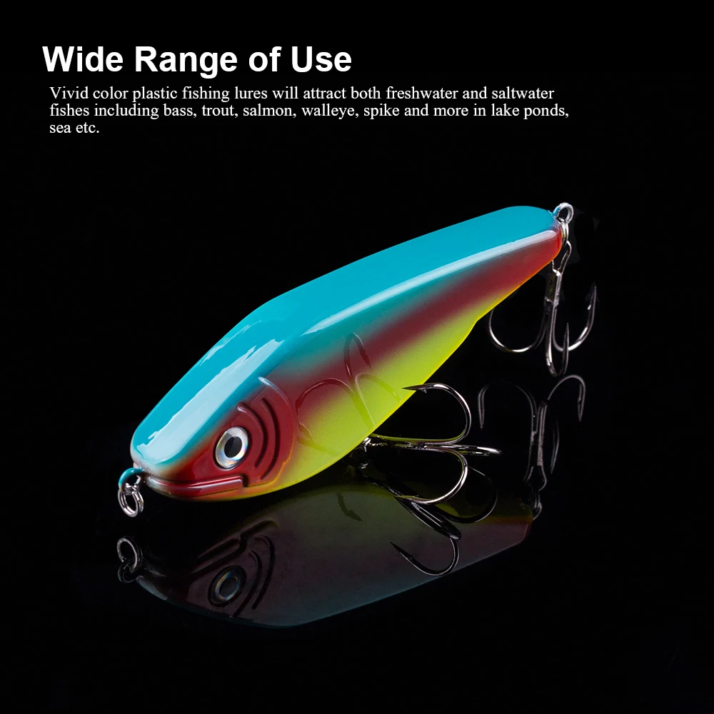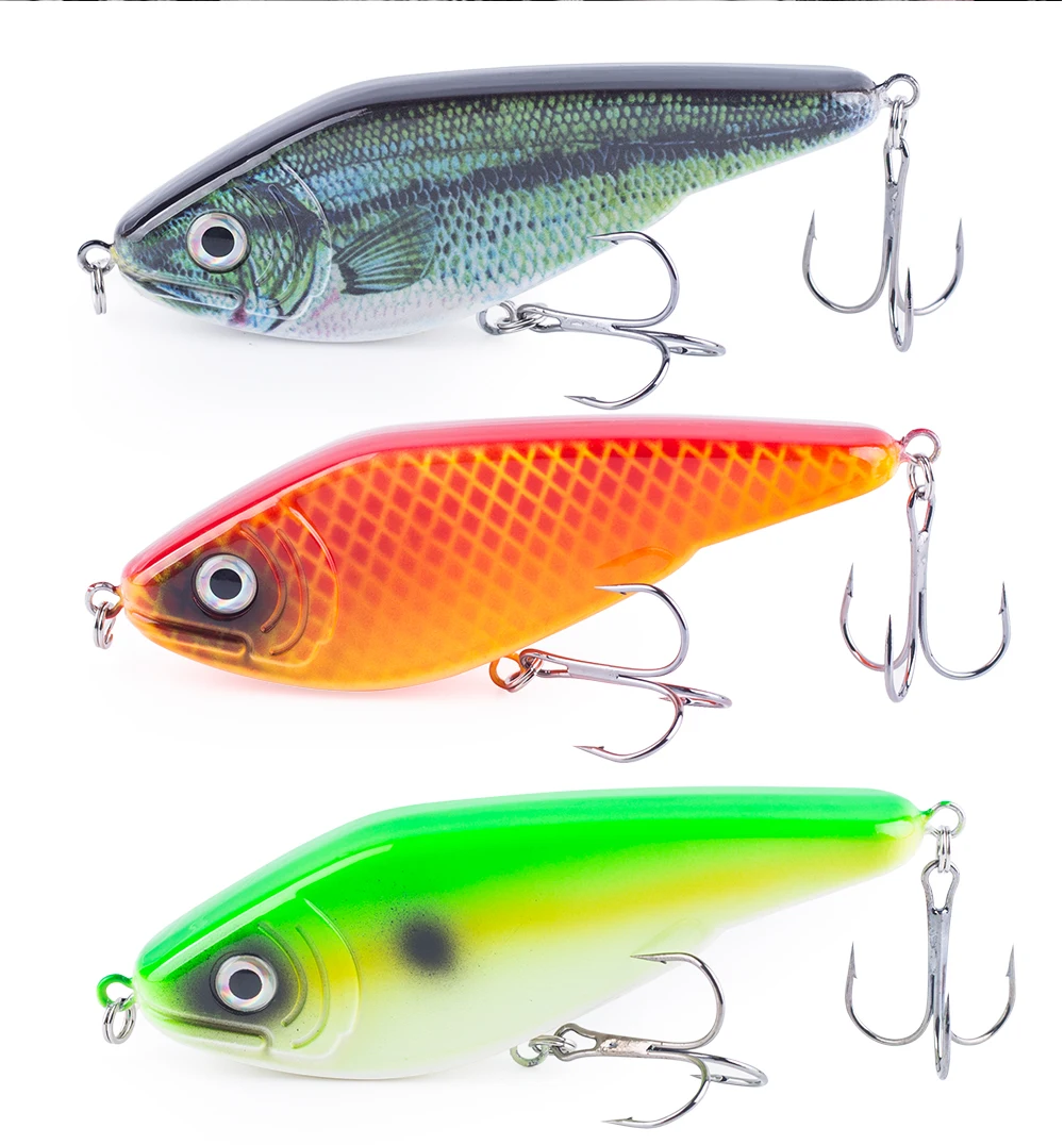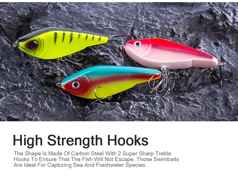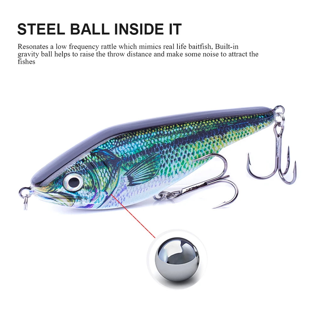 3) Estructura general: la estructura interna utiliza la bola de acero para equilibrar la conducción. Cuando Tomas la línea, la bola en el cuerpo se transmite a otras partes y produce sonido, lo que puede llevar al pez a perseguir. La forma está hecha de acero al carbono con 2 anzuelos triples súper afilados para garantizar que los peces no se escapen. Esos Jerkbaits son ideales para capturar especies marinas y de agua dulce.
