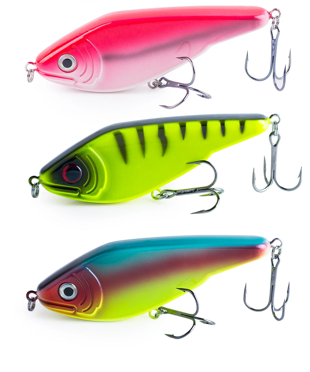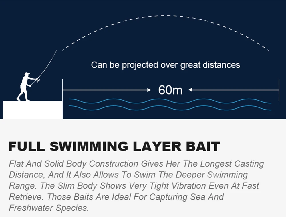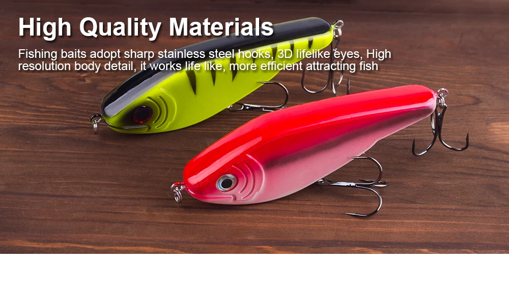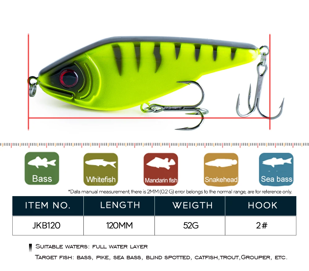 3) Estructura general: la estructura interna utiliza la bola de acero para equilibrar la conducción. Cuando Tomas la línea, la bola en el cuerpo se transmite a otras partes y produce sonido, lo que puede llevar al pez a perseguir. La forma está hecha de acero al carbono con 2 anzuelos triples súper afilados para garantizar que los peces no se escapen. Esos Jerkbaits son ideales para capturar especies marinas y de agua dulce.