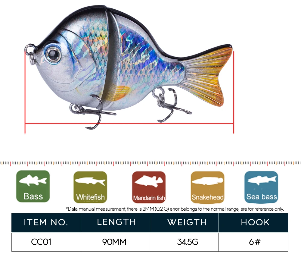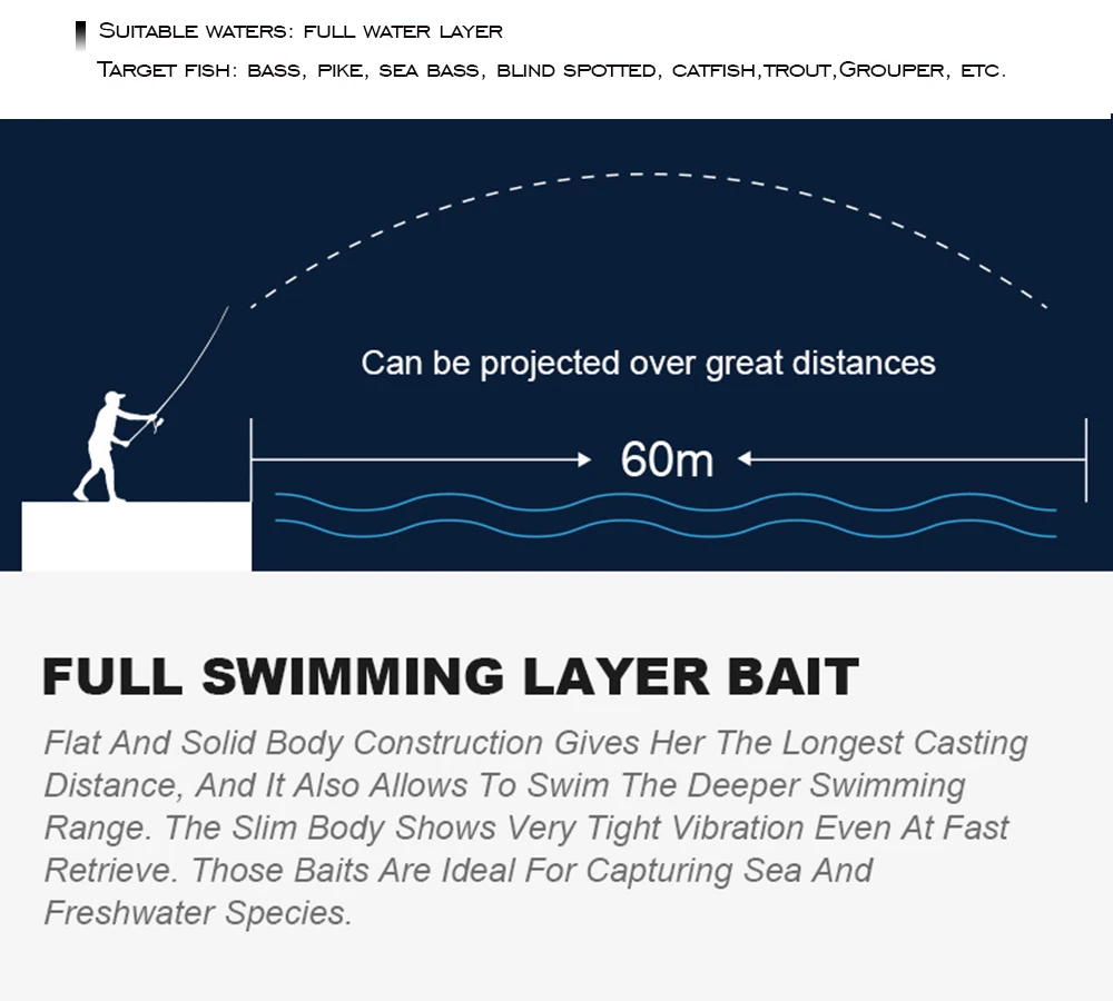 La acción de natación perfecta es mortalmente atractiva para los peces. Este Tipo de señuelo de pesca muestra una acción de natación animada en el agua, con bola de acero en el interior, Los cebos pueden mantenerse estables durante el lanzamiento y pueden aumentar la distancia de lanzamiento al mismo tiempo.