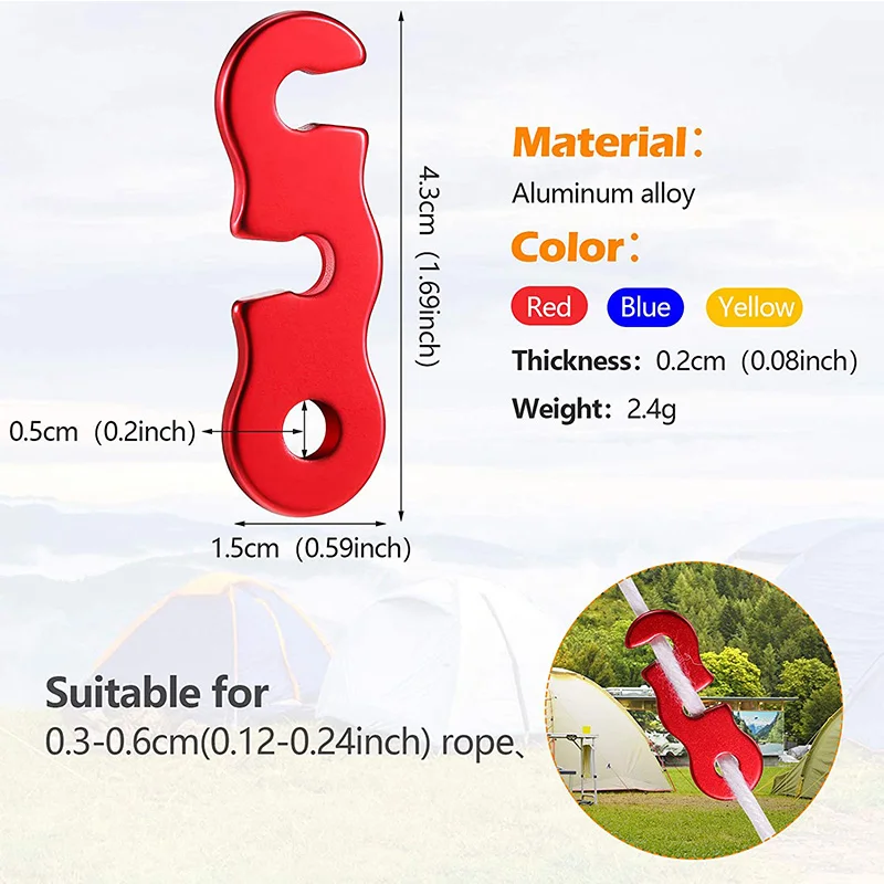 3. Las hebillas de cuerda miden 4,3 cm de largo y 1,2 cm de ancho; El diámetro de los agujeros es de 0,5 cm; Las hebillas de cuerda de viento de la tienda son adecuadas para ajustar la cuerda dentro de 0,5 cm;