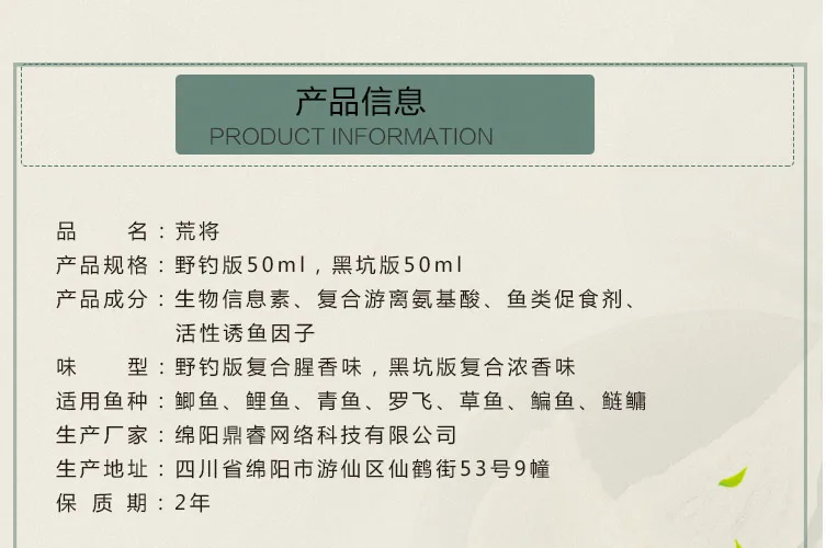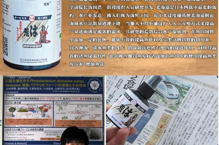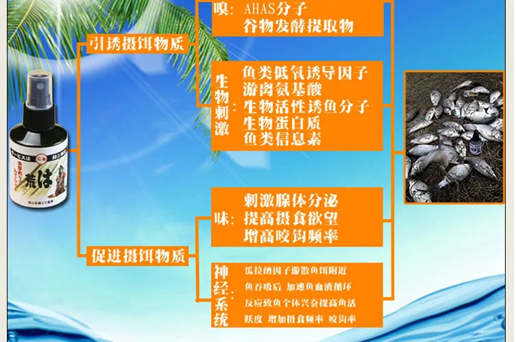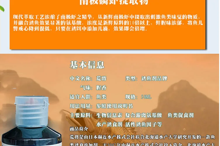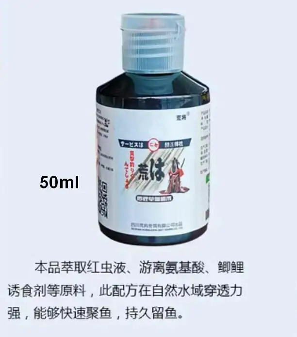D=HWANGWA (ALAWA), 50ml para pesca salvaje.Importado de Japón, embotellado en China.Este es el único Aditivo Gary recomendado después de pescar durante años.Tiene un olor especial que es más fácil recoger a los peces cuál sea el clima, especialmente cuando hace frío, úsalo, mézclalo con el cebo del anzuelo.Garantía de calidad 2 años.Dosis de aditivos:1-3 ml por 100 g de cebo en polvo.Mezclar primero con agua.Puede ajustar más o menos según el clima y la temperatura del agua.Los peces morderán incluso si se trata de una piedra que alguna vez sumergido en Hwangwa (ALAWA) y en una mezcla de agua.Es barato y con buen funcionamiento.