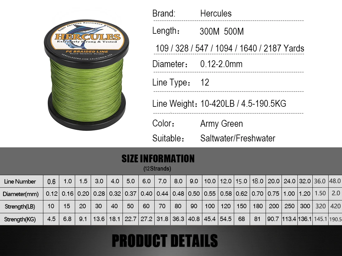 Hercules-sedal de Pesca trenzado de 12 hebras, multifilamento de PE verde militar, alambre trenzado de Pesca de 100m-2000M, aparejos de carpa de río de 10-420LB