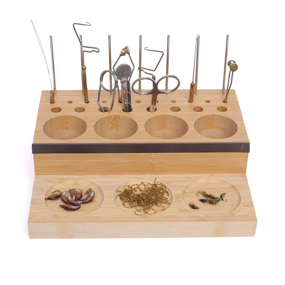 CALIDAD PREMIUM: Nuestra duradera Estación de atado de moscas de madera de bambú rinde año tras año de uso, comodidad y disfrute. Guarde sus suministros de pesca con mosca fácilmente con nuestro práctico organizador de herramientas de pesca.