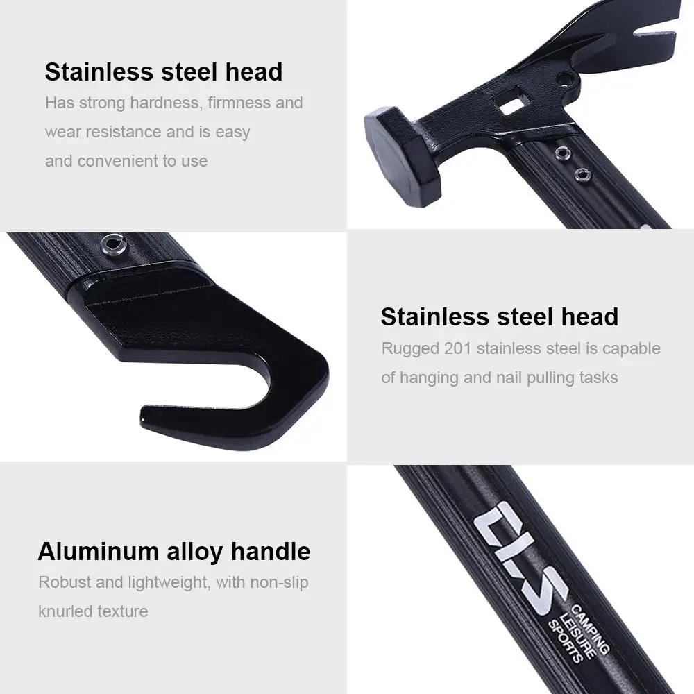 1. Mini and Compact: The tent nail hammer consists of stainless steel head and aluminum alloy handle, durable, lightweight and portable.