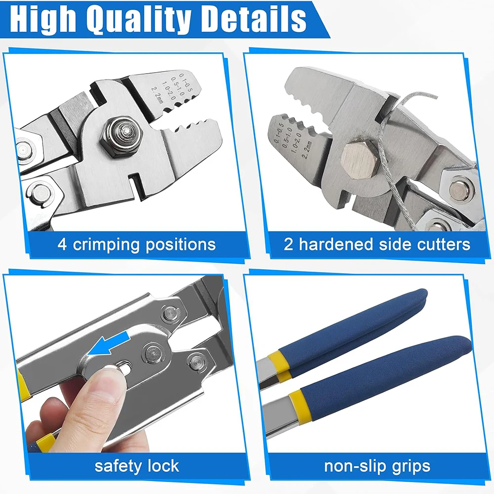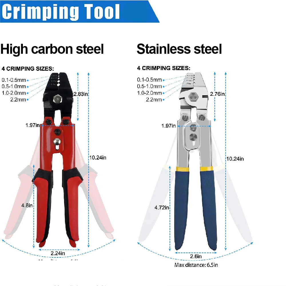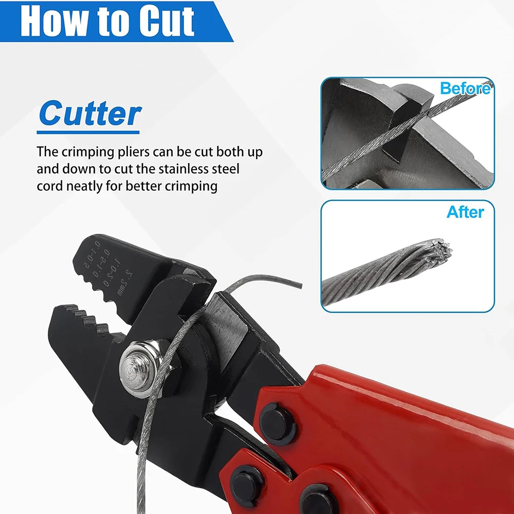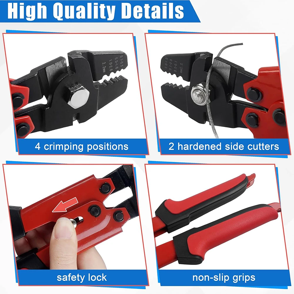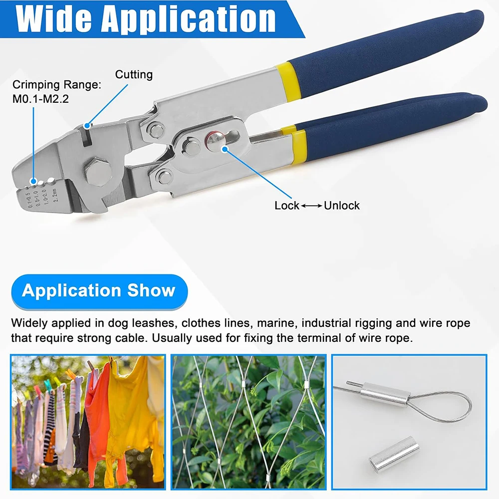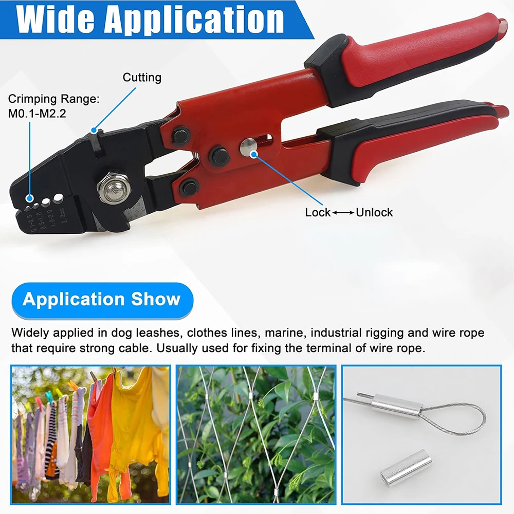 3. La herramienta de engarce coordinada con la virola del barril puede usarse ampliamente para barandillas, cuerdas para perros, tendederos, mangas de engarce de pesca, cuadros colgantes u otras redes de barandillas y aparejos marinos e industriales.