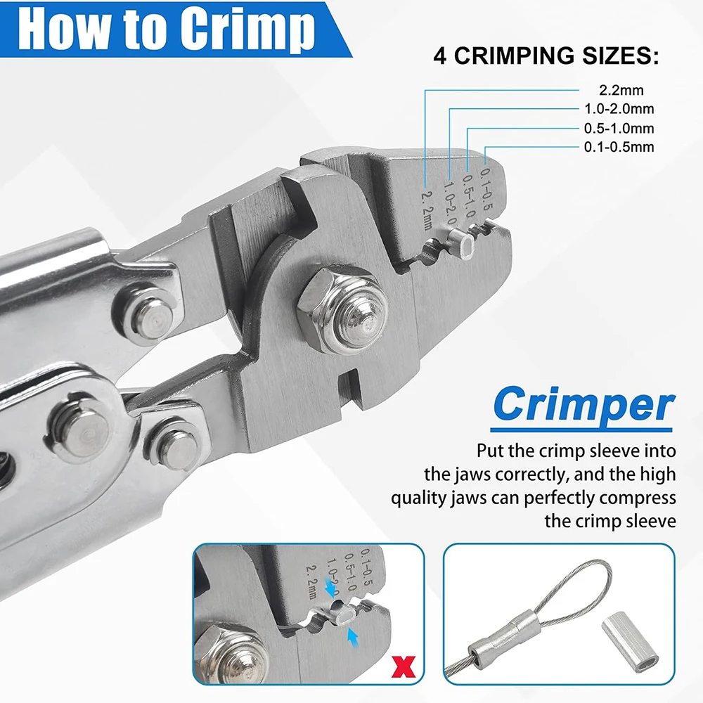 2.Tiene 4 posiciones de engarzado: 0,1-0,5 mm, 0,5-1,0 mm, 1,0-2,0 mm, 2,2 mm. Puede engarzar fácilmente la funda y más desde una línea de prueba de 50 a 450 lb.