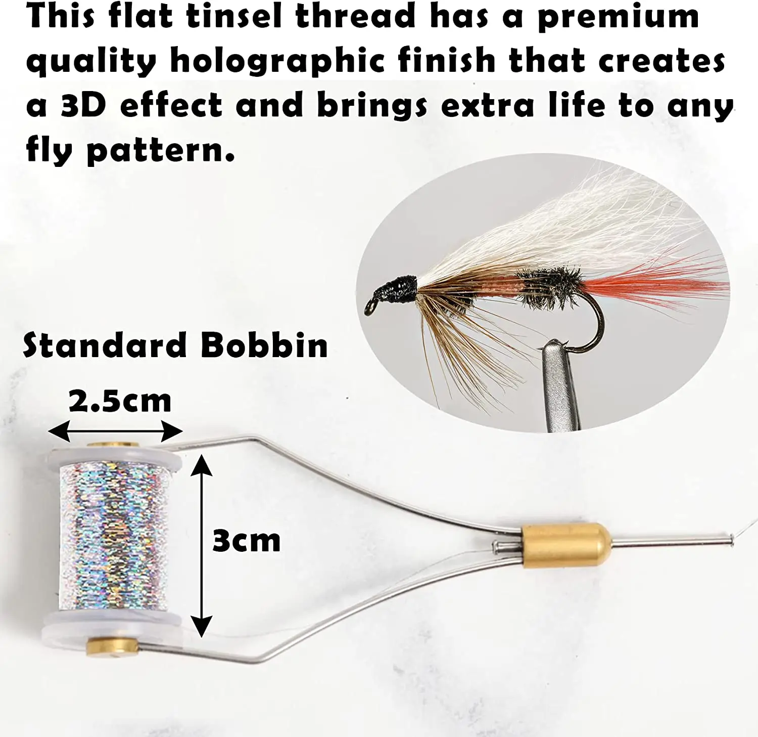 Riverruns 12 colores micro glint Tinsel, también llamado hilo metálico para atar moscas, este hilo está hecho de finos hilos en bobina iridiscentes de varias hebras, lo que es perfecto para aplicaciones de atado de moscas de trucha y es ideal para atar zumbadores, ninfas pequeñas y moscas secas.