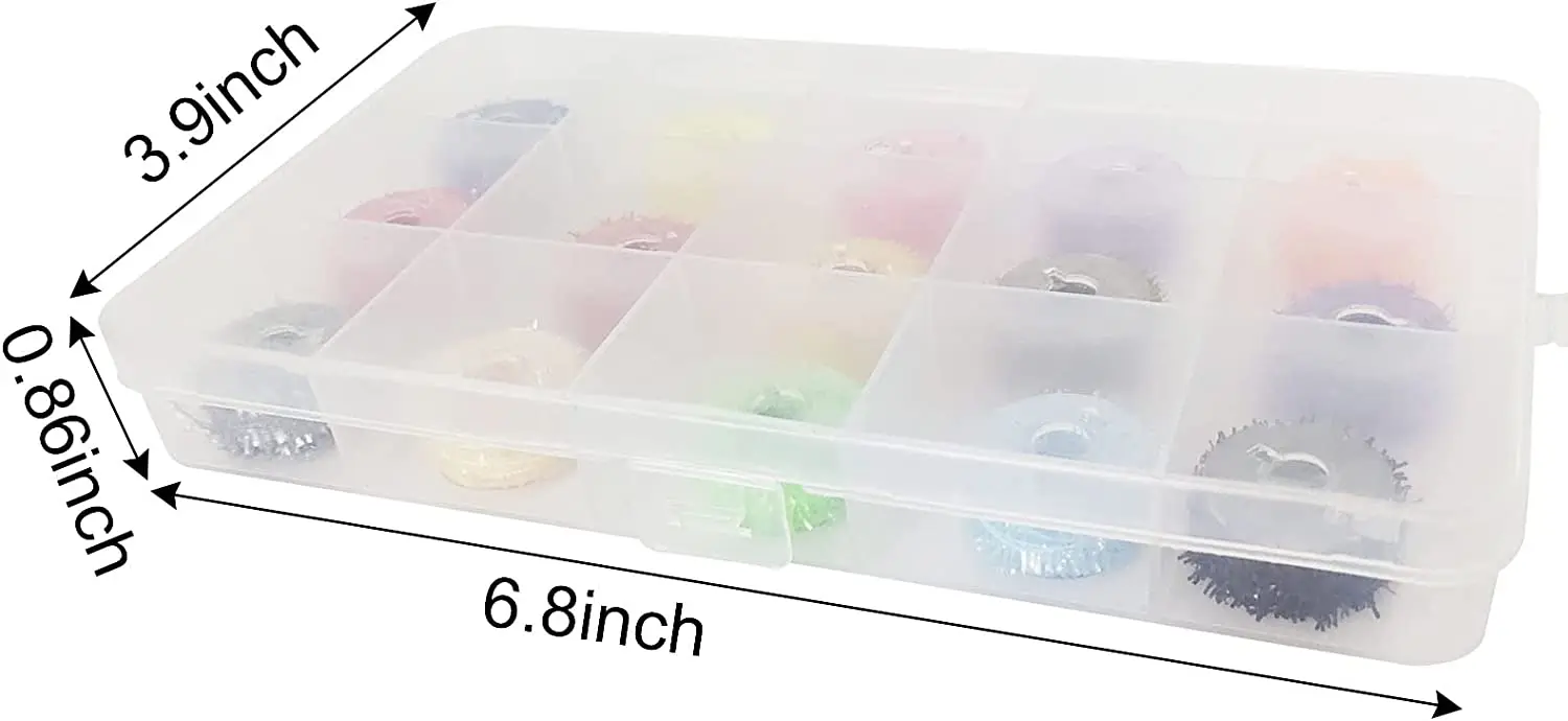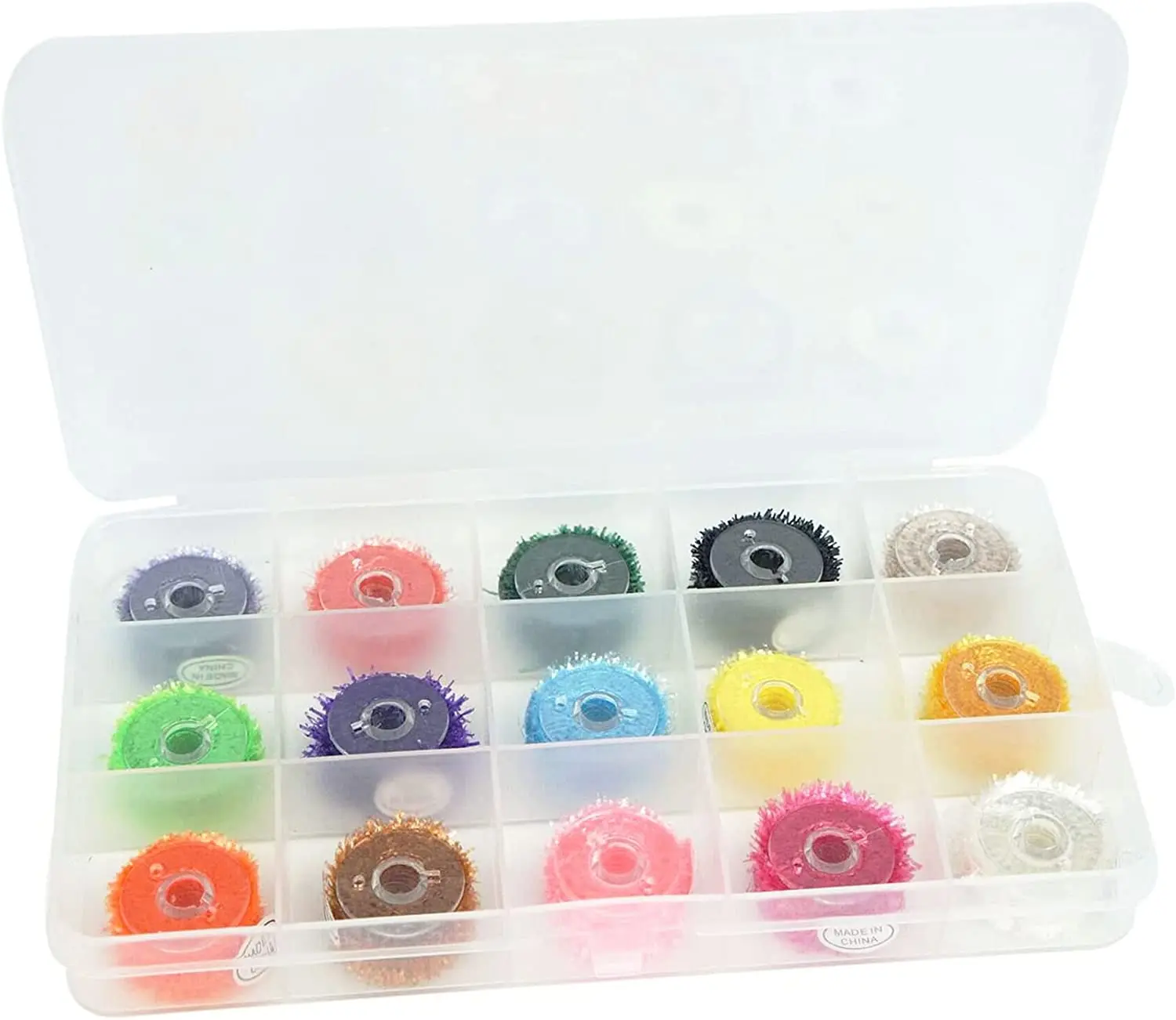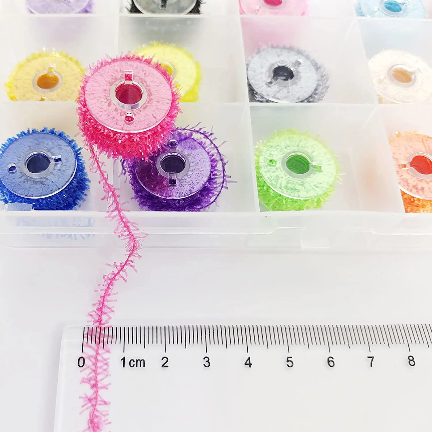 Dos opciones de embalaje diferentes: A.15 colores populares seleccionados Chenille con una caja de embalaje de compartimento Púrpura claro, marrón, Oliva oscuro, negro, plata, Verde Chartreuse, púrpura, azul, amarillo, dorado, naranja, Rosa Camarón, rosa, fucsia, blanco. Anchura de chenilla: mediana, aproximadamente 0,28 pulgadas/7mm. Longitud de chenilla: 4,5 metros para cada color por carrete.