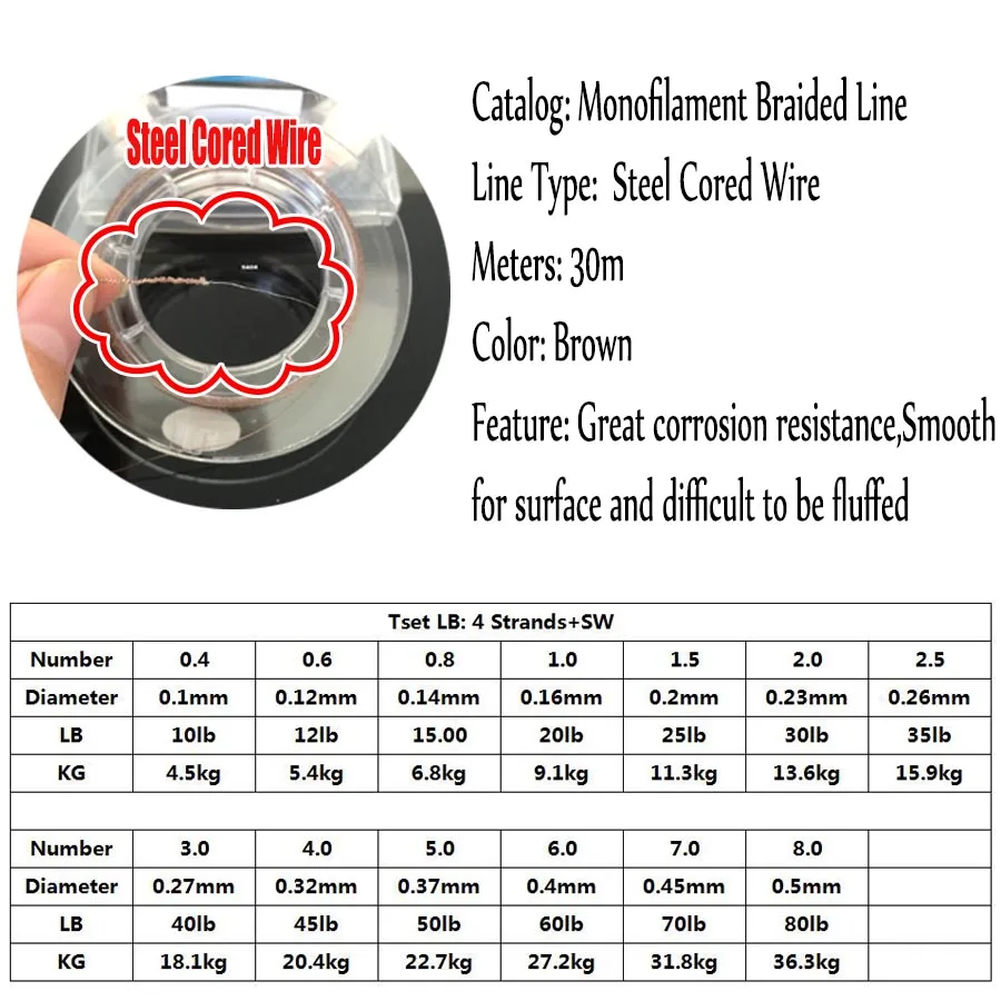 Monofilament Braided Fishing Line Steel CoredWire Fishing Line Braid Line Fishing 30m Sink WireMax Drag 36.3kg 80lb