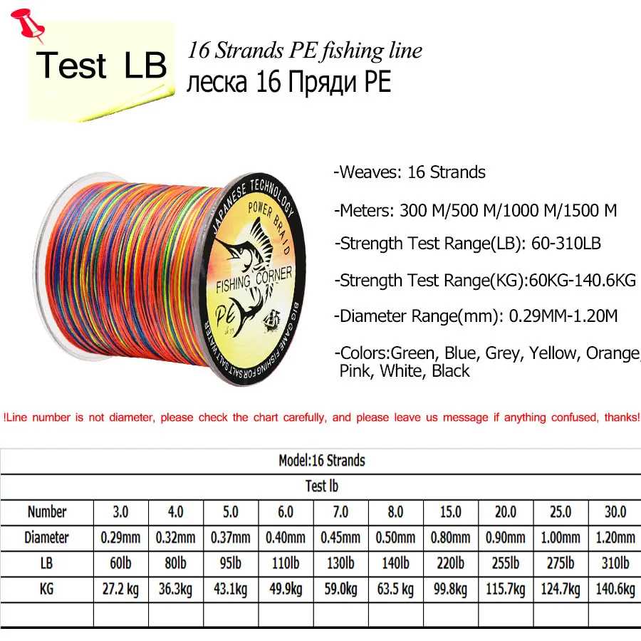 Línea trenzada de pesca de 16 hebras, multifilamento Multicolor, 300M/500M/1000M/1500M, Japón, línea de agua salada