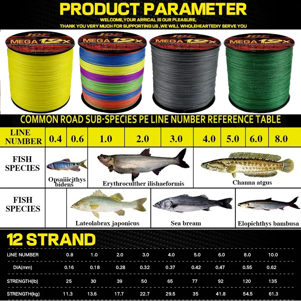 El sedal trenzado de 12 hebras es adecuado para todo tipo de pesca de alta intensidad, por lo que es perfecto para la pesca en el mar, la pesca en barcos y los peces ancla. Es particularmente ideal para pescar en lugares con estructuras submarinas complicadas o demasiados obstáculos, como áreas de hierba pesada, lugares con muchas piedras y muchas ramas.