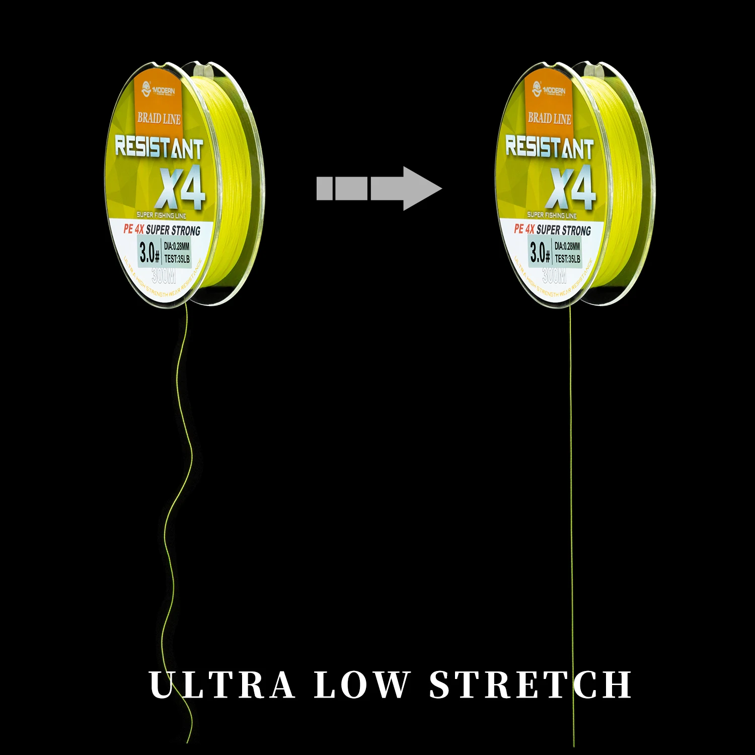 2.Línea de PE de 4 hebras, material de Japón, construcción trenzada única, hecha de fibras de PE de ultra alta resistencia.