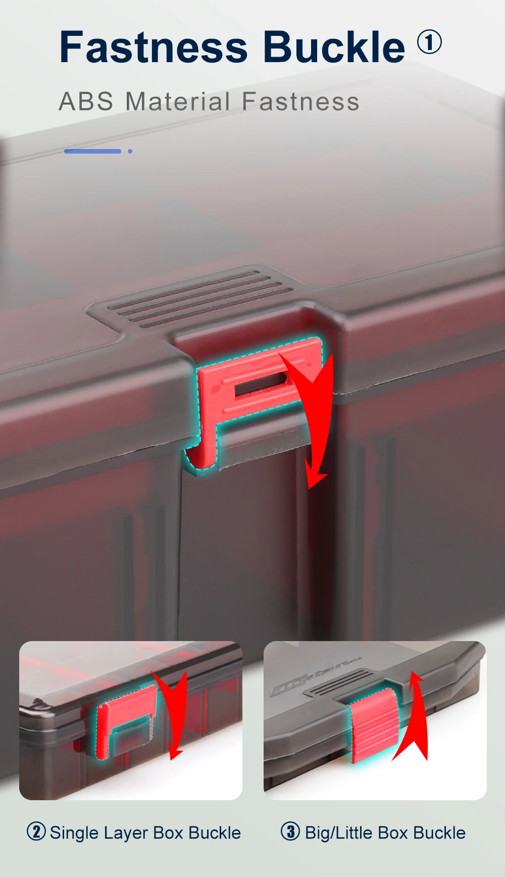 • Tablero desmontable:Equipado con un tablero desmontable, esta caja de aparejos permite opciones de almacenamiento personalizables. Puede ajustar el espacio según sus necesidades, por lo que es perfecto para varios accesorios de pesca.