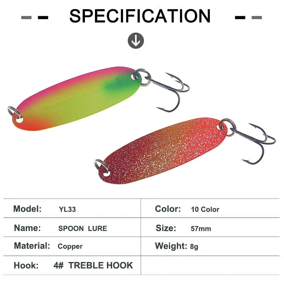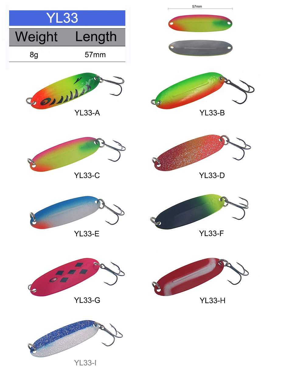 1. Nombre: YL332. Tipo: cuchara de pesca3. Longitud: 57mm4. Peso: 8g5. Color: A,B,C,D,E,F,G,H,I6. Calidad: 1 ud.