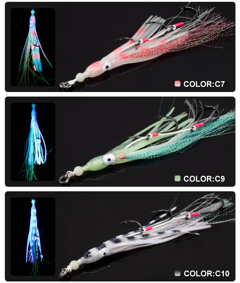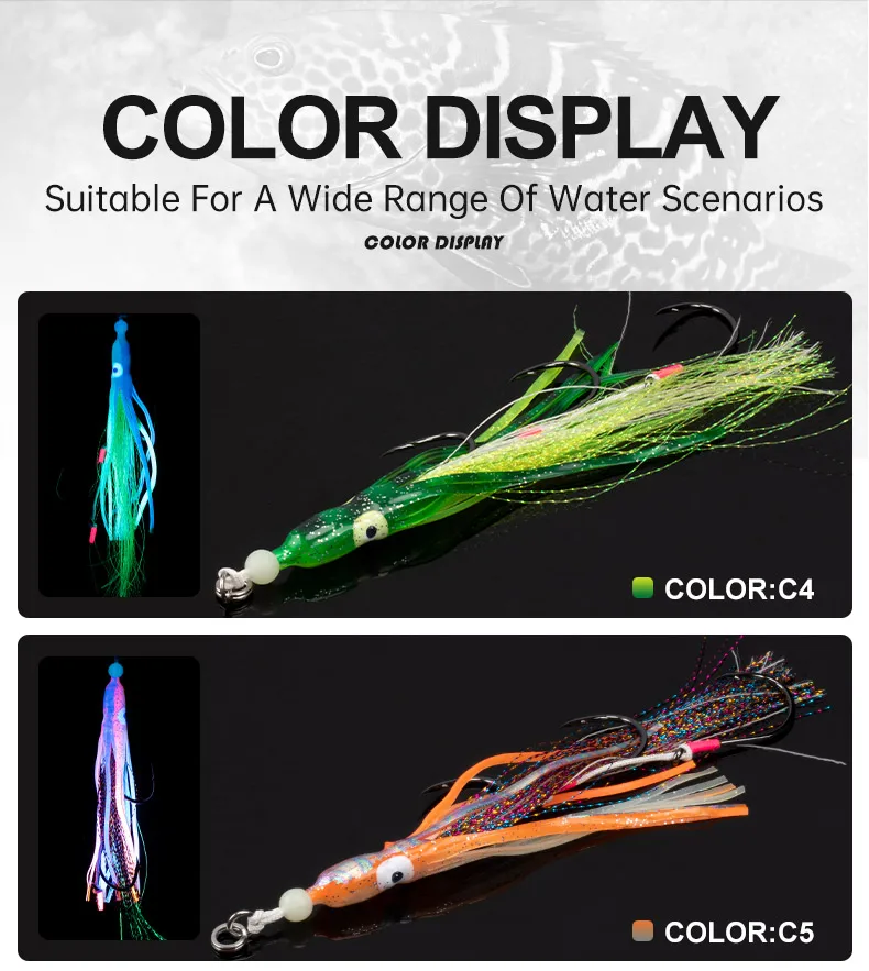5.Este cebo auxiliar también tiene un teaser de calamar en la parte superior para ayudar aún más a un deslizamiento más aerodinámico hacia el fondo.
