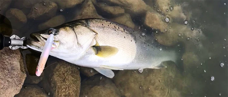 Estilo de natación 1: la hélice de cola se fija en la hebilla y la punta de la varilla se mueve ligeramente hacia abajo. El estilo de natación es un rastreador de ondas de lápiz en forma de Z en la superficie del agua.