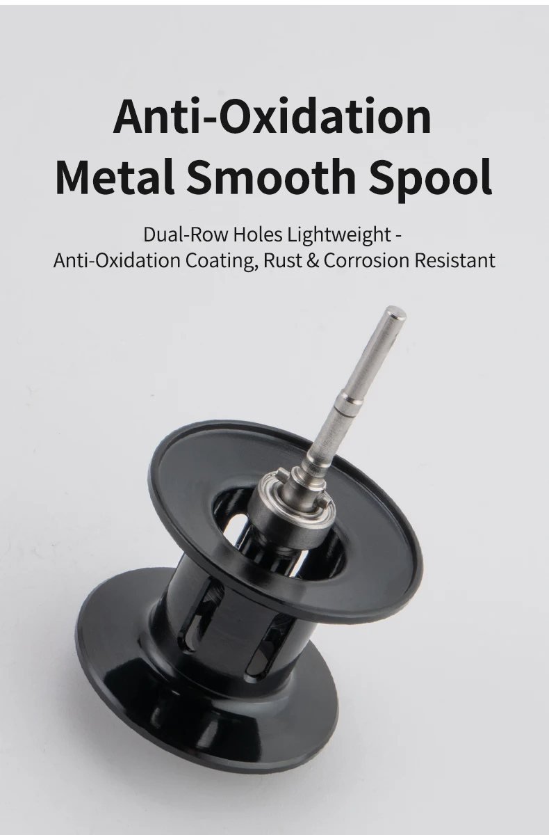 Carrete de aleación ultraligero mecanizado por CNCFresado con precisión para un peso mínimo y un equilibrio óptimo, su superficie está tratada con un revestimiento antioxidante para una resistencia superior a la corrosión. Esto garantiza una rotación centrífuga estable, brindando lanzamientos más suaves, más largos y más precisos tanto en entornos de agua dulce como salada.