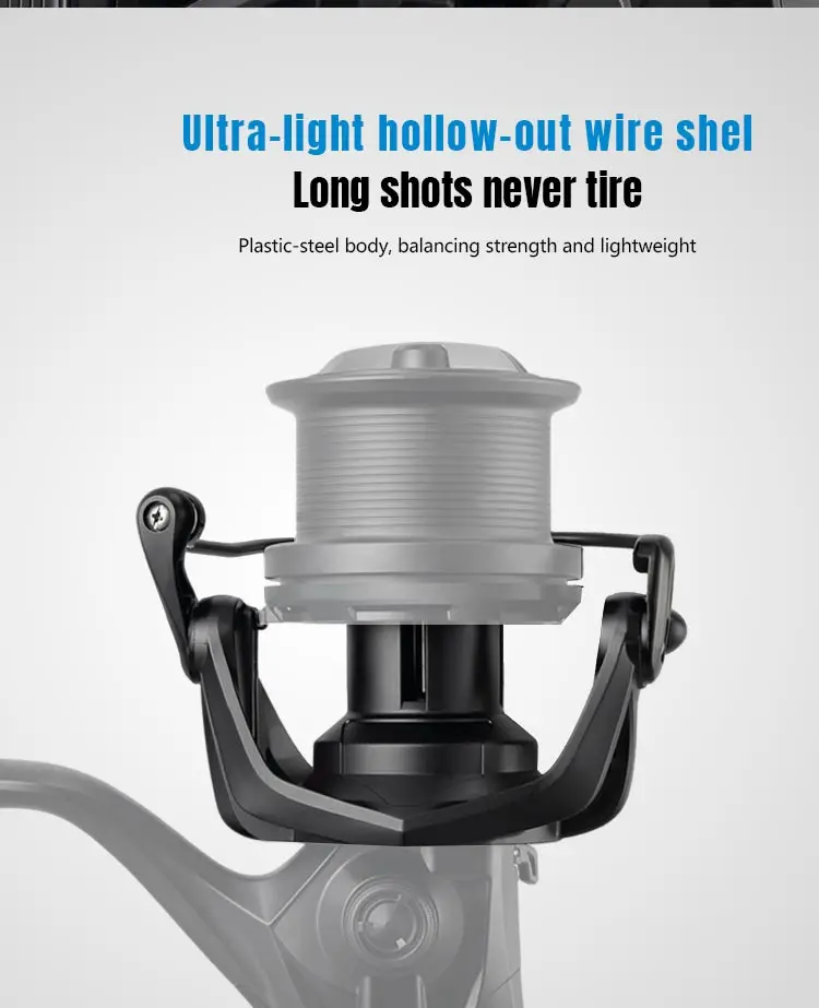 Construido con un compuesto de acero polímero de ingeniería, el marco logra un equilibrio óptimo entre resistencia y reducción de peso.Reduce la fatiga del brazo durante largas sesiones de lanzamiento, lo que lo hace ideal para la pesca de surf y para uso en barco durante todo el día.