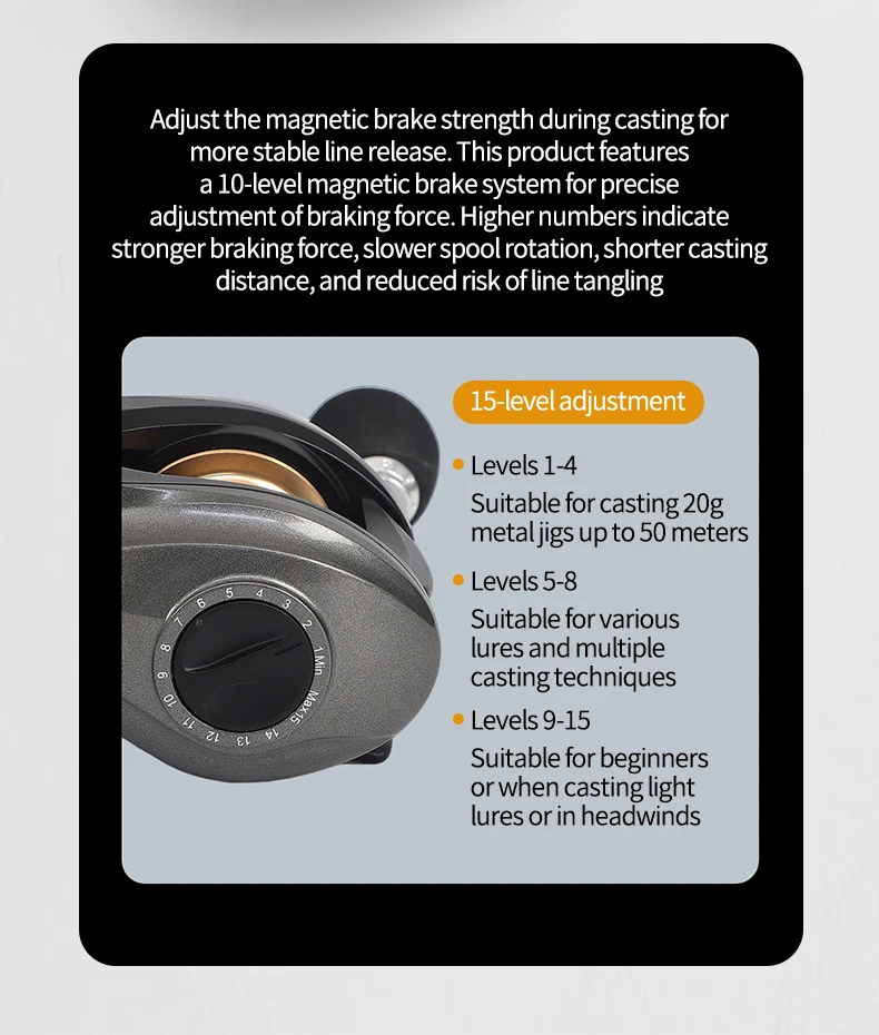 Cuenta con un producto de mayor energía magnética para gestionar eficazmente carretes ultraligeros incluso a altas velocidades, lo que reduce significativamente los palancos durante los delicados lanzamientos finos.