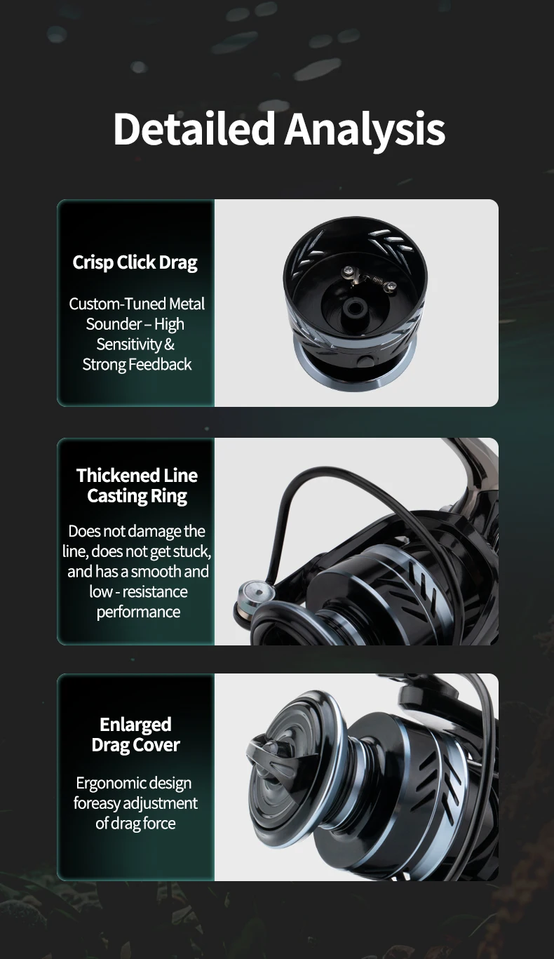 Nuestros engranajes y componentes internos diseñados con precisión están sellados y combinados para un rendimiento impecable.Experimente cero juego y recuperaciones suaves como la seda, lanzadas después del lanzamiento.Es la potencia perfecta que necesita para un gancho sólido y un arranque sin esfuerzo.