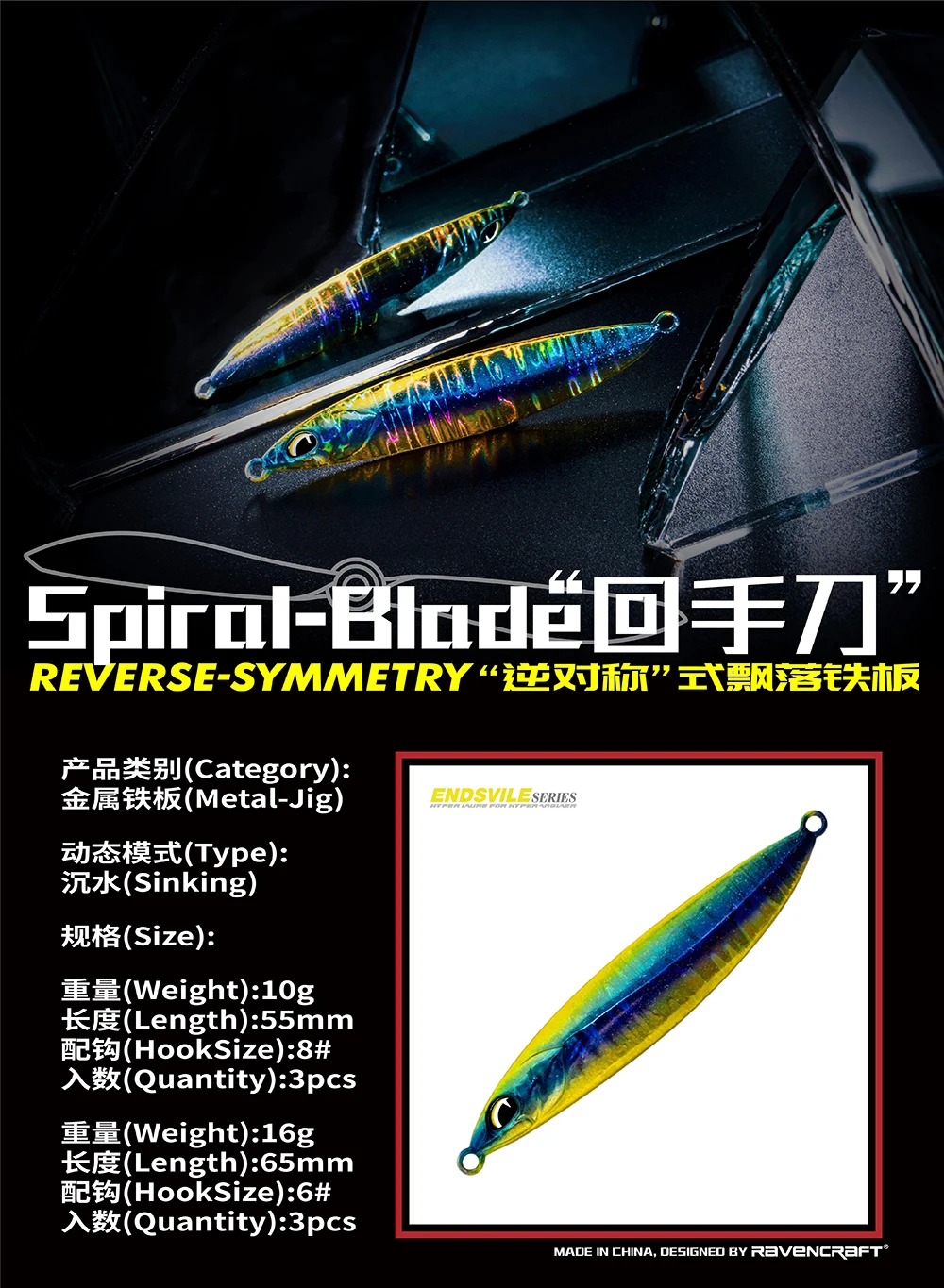 Concepto de diseño de hélice de referencia de plantillas de pesca "ESPIRAL-BLADE", estructura principal de estilo de creación original "REVERSE-SYMMETRY", hace que el estilo de natación del jigging sea más flexible.