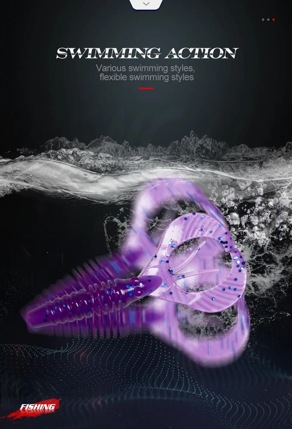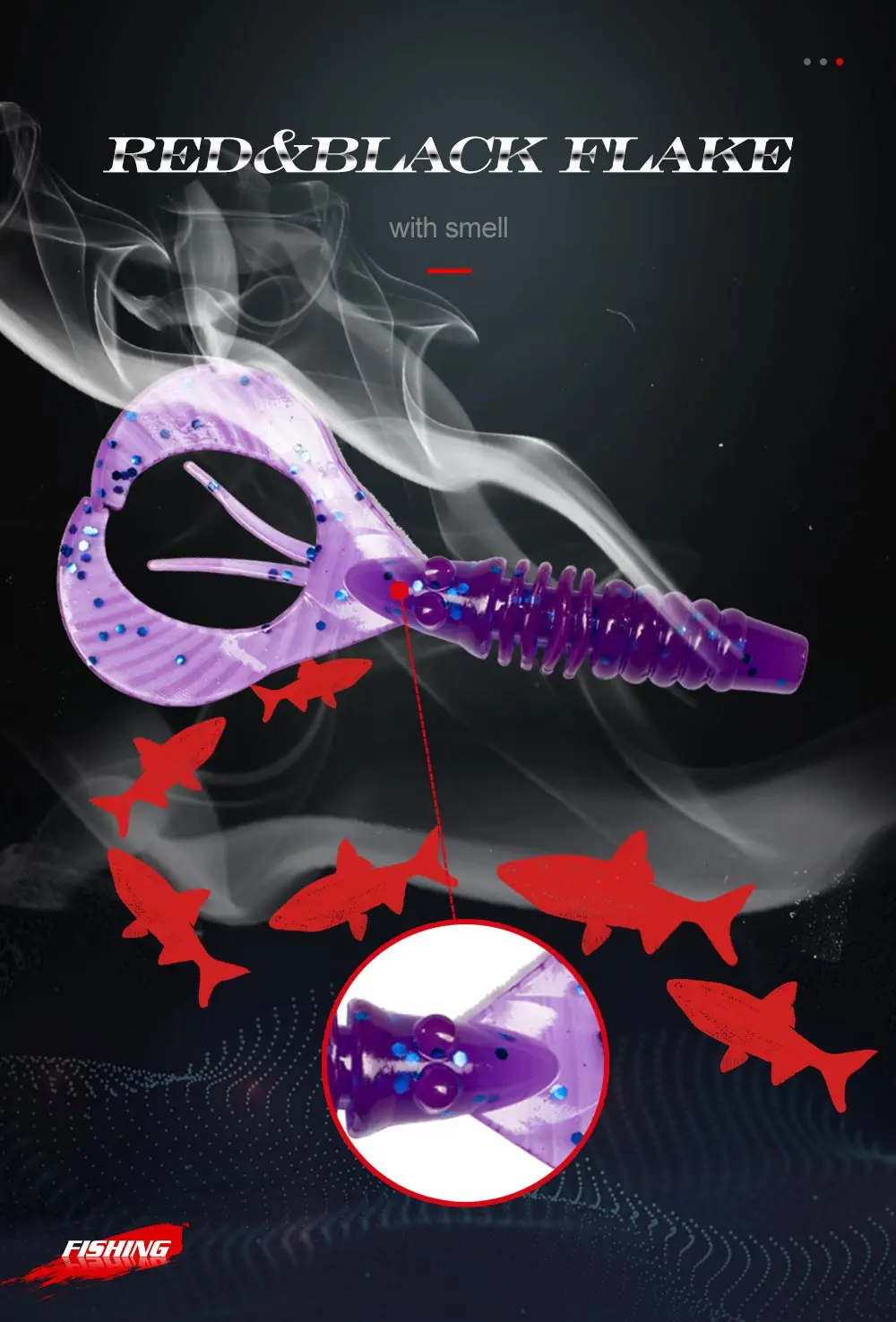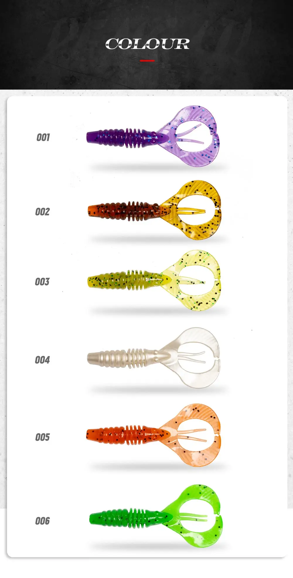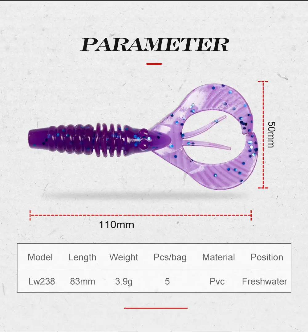 Posición agua dulceLongitud 83mmPeso 3,9GColor 6 coloresCantidad: 5 piezas/bolsaMaterial: PVCPescado objetivo: Lucio, lubinaModelo: señuelo suave de camarónAcción: varios estilos de natación