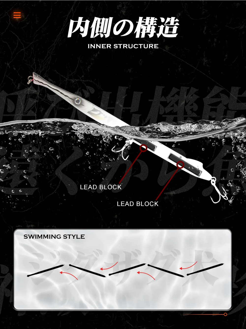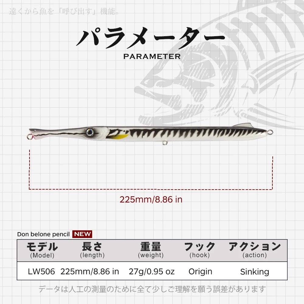 Longitud: 225mmTipo: cebo lápiz de hundimiento pesadoPeso: 27g/23gTriples: vendidos con anzuelos triplesObjetivo: baracuda, pez azul, pez Leerfish, lubina, Delfín, atún rojo, Amberjack.Profundidad de natación: variableEste señuelo en forma de lápiz imita una aguja pequeña, un alimento básico para cada gran depredador (pez azul, pez leerfish, lubina, muchas especies de atún, Delfín, baracuda...). La versión estándar de 27g se hunde y ayuda a los depredadores de la caza de pescadores en diferentes etapas a través de la columna de agua mientras trabaja la muestra con varias acciones y pasos, también diseñamos un estilo de 23g flotantes para elegir.