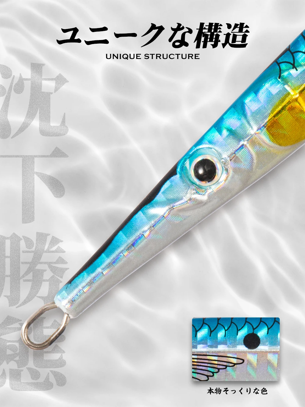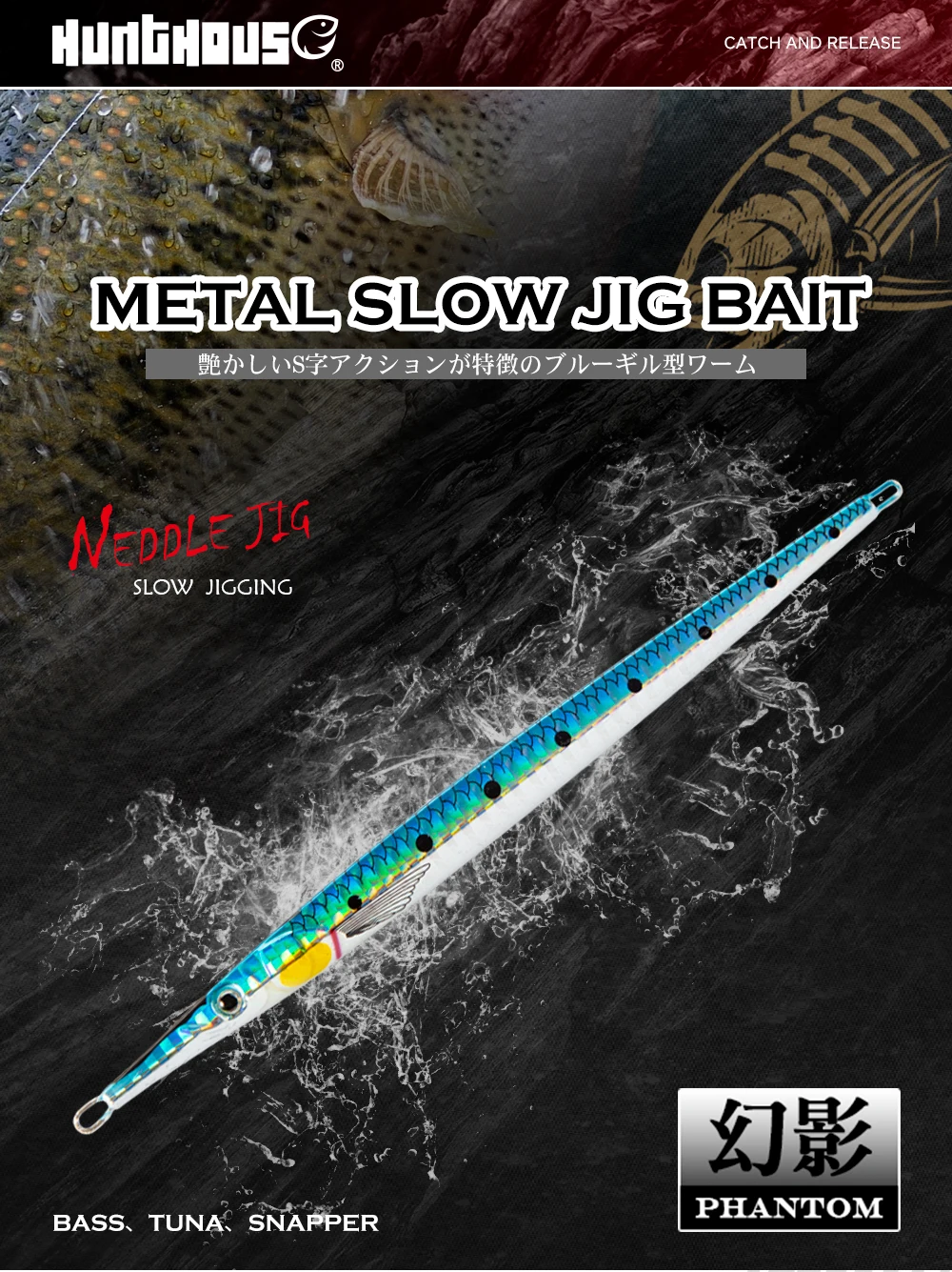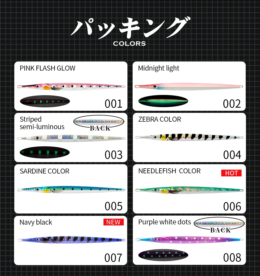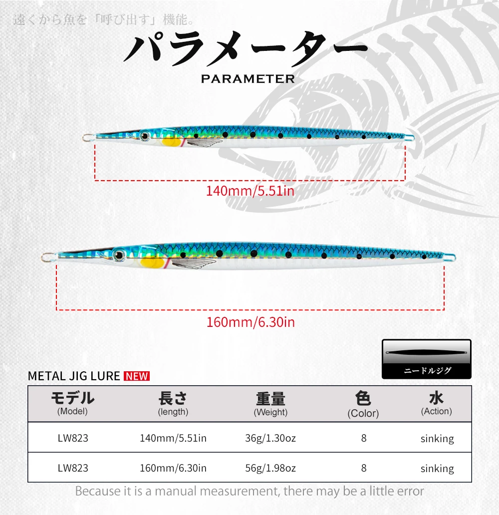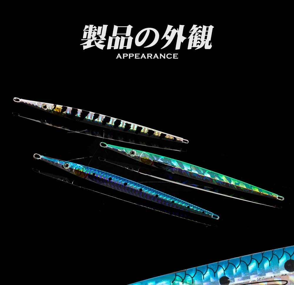 ¡La plantilla de aguja es la imitación de metal perfecta de un ago! El cuerpo largo y delgado lanzará una milla y tendrá muy poca resistencia en el agua. El perfil geométrico hace que el señuelo brille y parpadee en la caída, deslizándose y alejándose de la línea de recuperación, enviando destellos y vibraciones en un patrón de movimiento muy errático. El cuerpo tiene un sonajero de acero incorporado, que emite un fuerte sonido de clic en jigging, atrayendo a los peces depredadores desde la distancia. La plantilla de aguja tiene una acción híbrida y puede usarse perfecta para jigging vertical, jigging en la costa, jigging fundido y jigging lento.