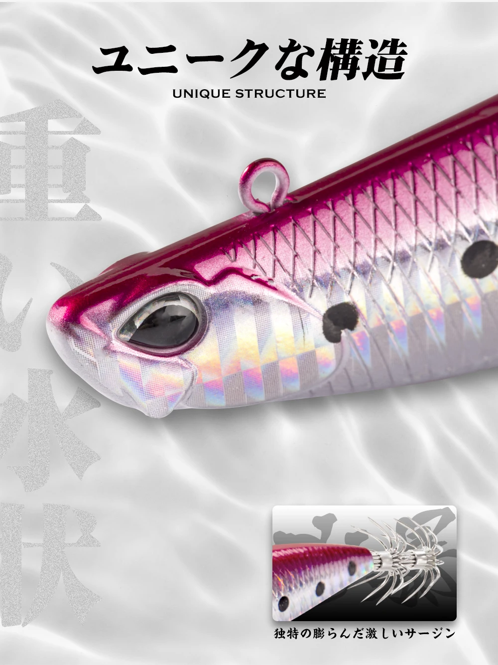 Al eliminar el ala de plumas que causaba el arrastre e internalizar el peso en el cuerpo, llega a la parte inferior a un ritmo rápido y permite una acción de dardos ligera pero afilada en la zona profunda. Otra atracción del D-Squid es la línea de color. Además, hemos logrado una forma corporal que permite que el señuelo mantenga una posición corporal ideal después de la acción de lanzamiento. Esto da como resultado el aumento de las mordeduras y elimina el molesto problema de que el anzuelo atrape la línea.