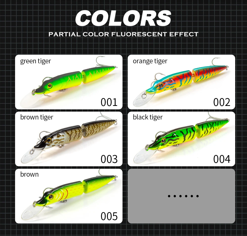 1. Longitud 120mm/160mm 2. Peso 15,5g/32G 3. Material ABS 4. Tipo Minnow swimbait artificial 5. Color 5 colores