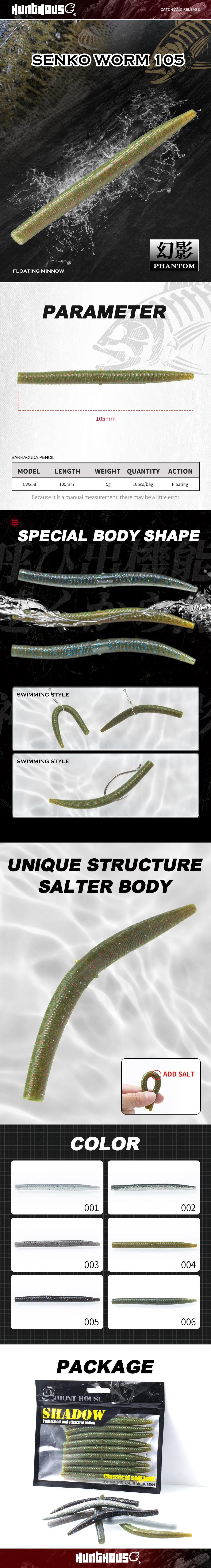 Señuelo de pesca suave Hunthouse, 105mm, 5g, 10 unidades/bolsa, gusano Senko, cebo Artificial de plástico para lubina, aparejos de pesca de agua salada/agua dulce