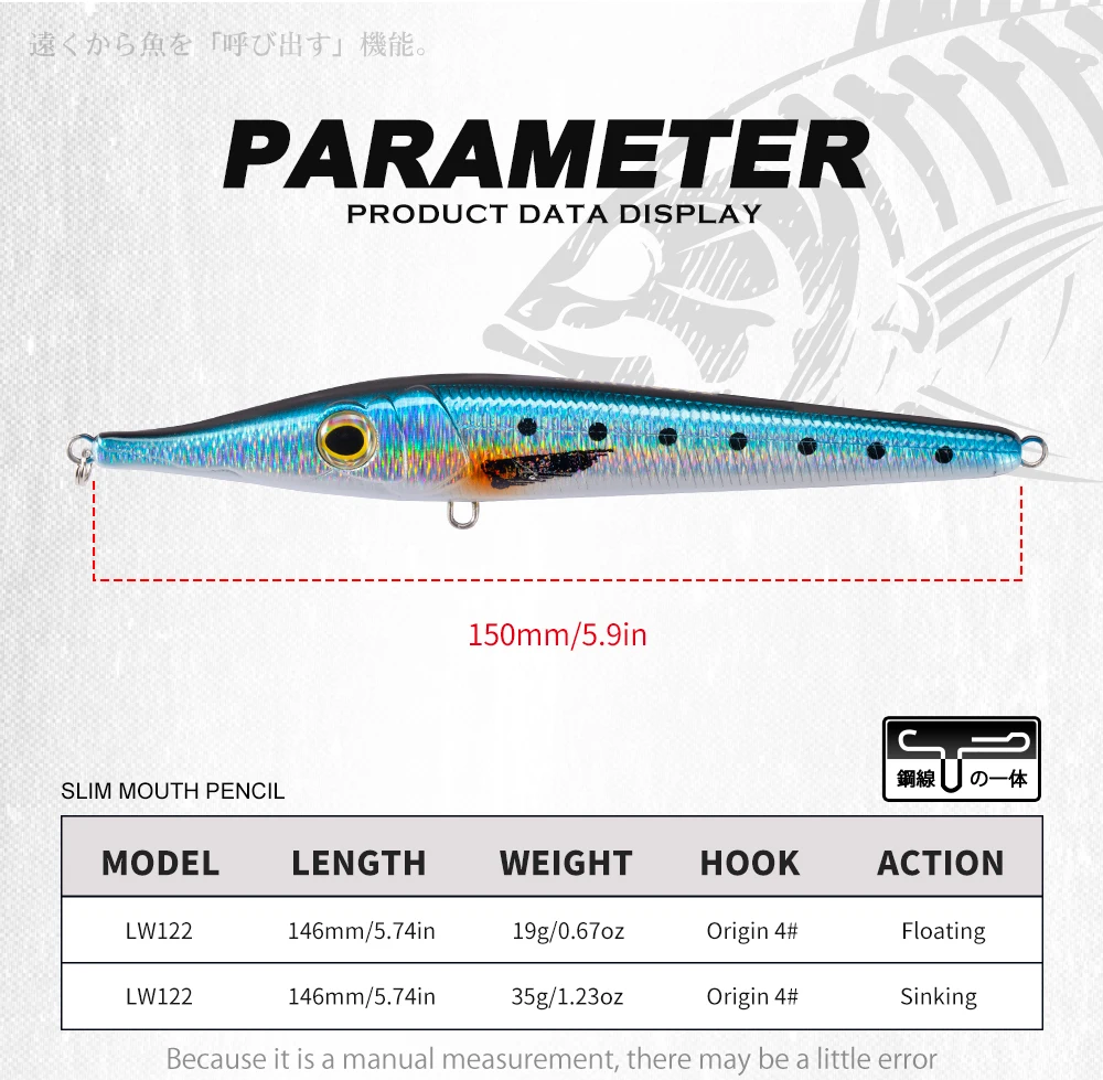 Hunthouse-señuelo de pesca tipo lápiz, cebo de 146mm, 19g, flotante de fundición larga para lubina, Zargana, Wobber