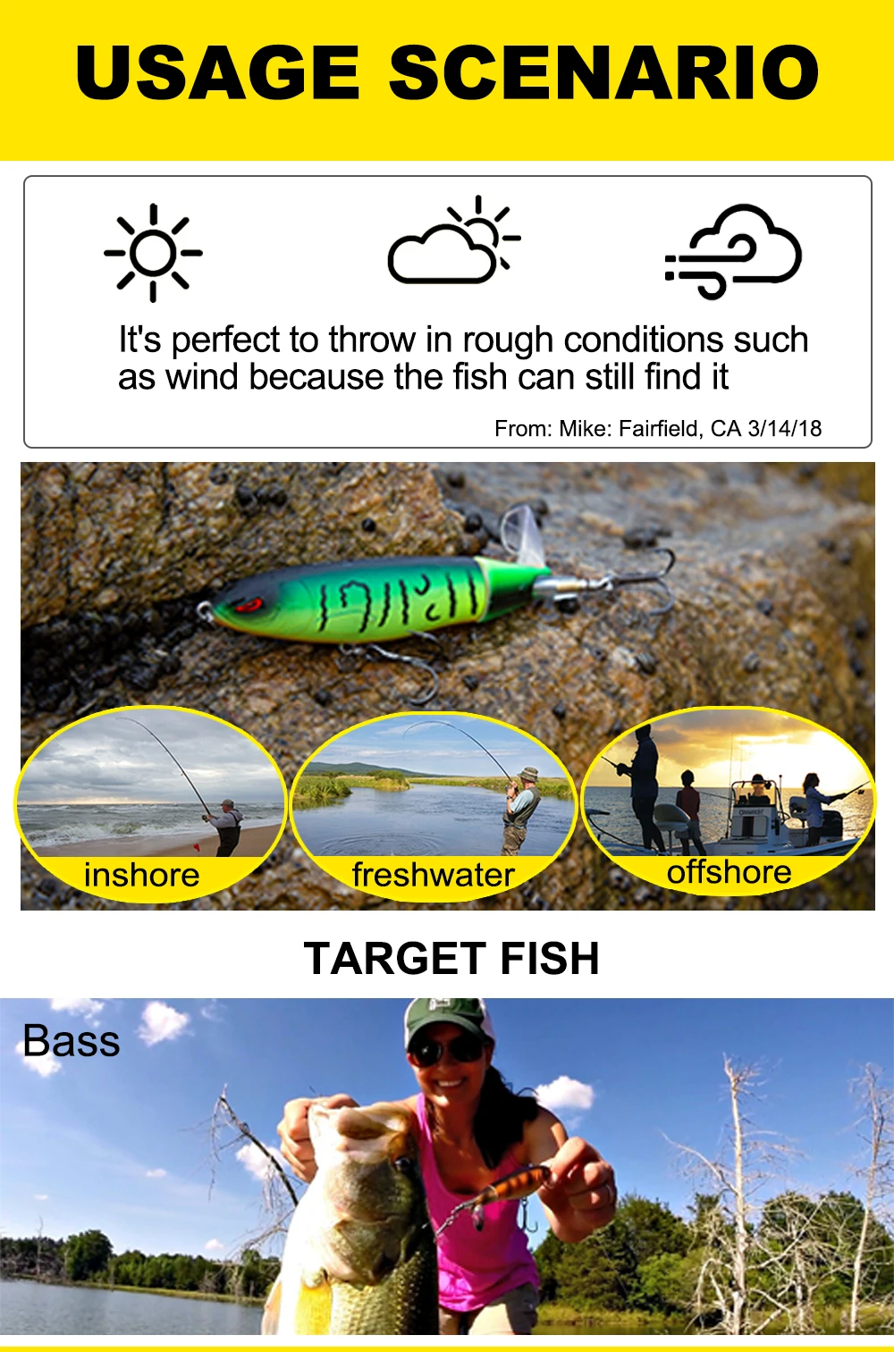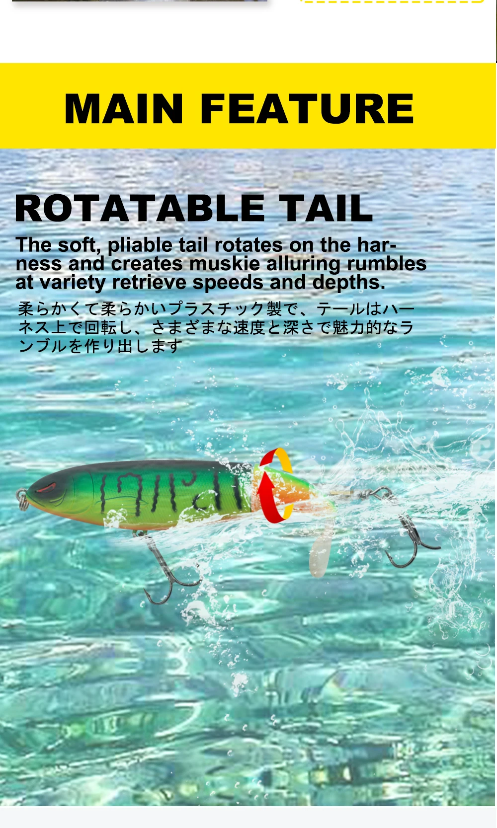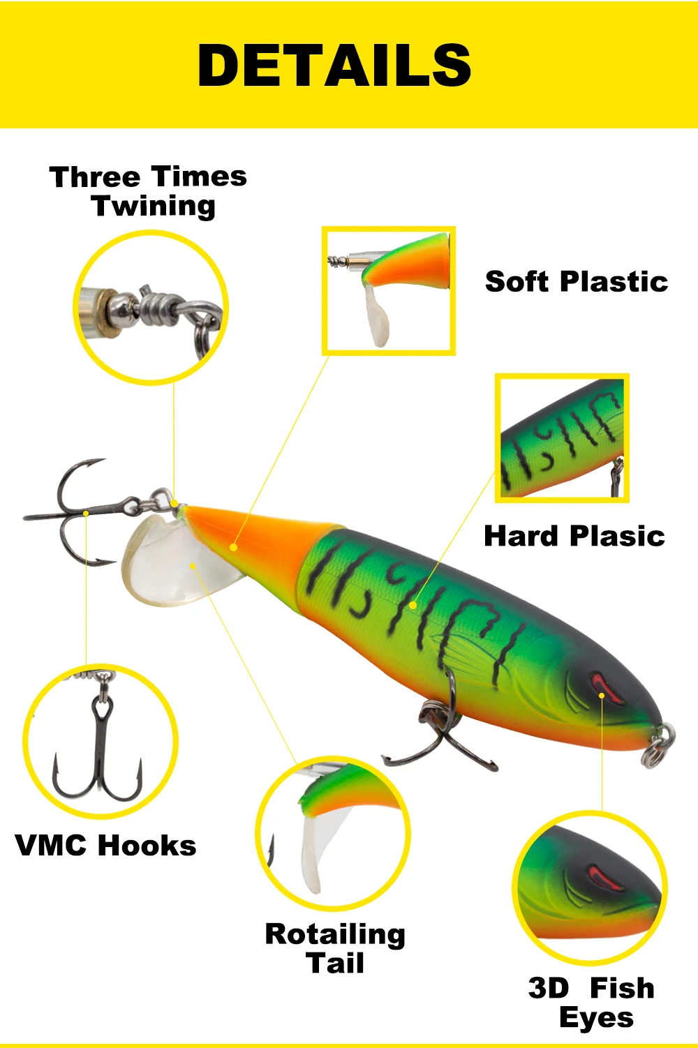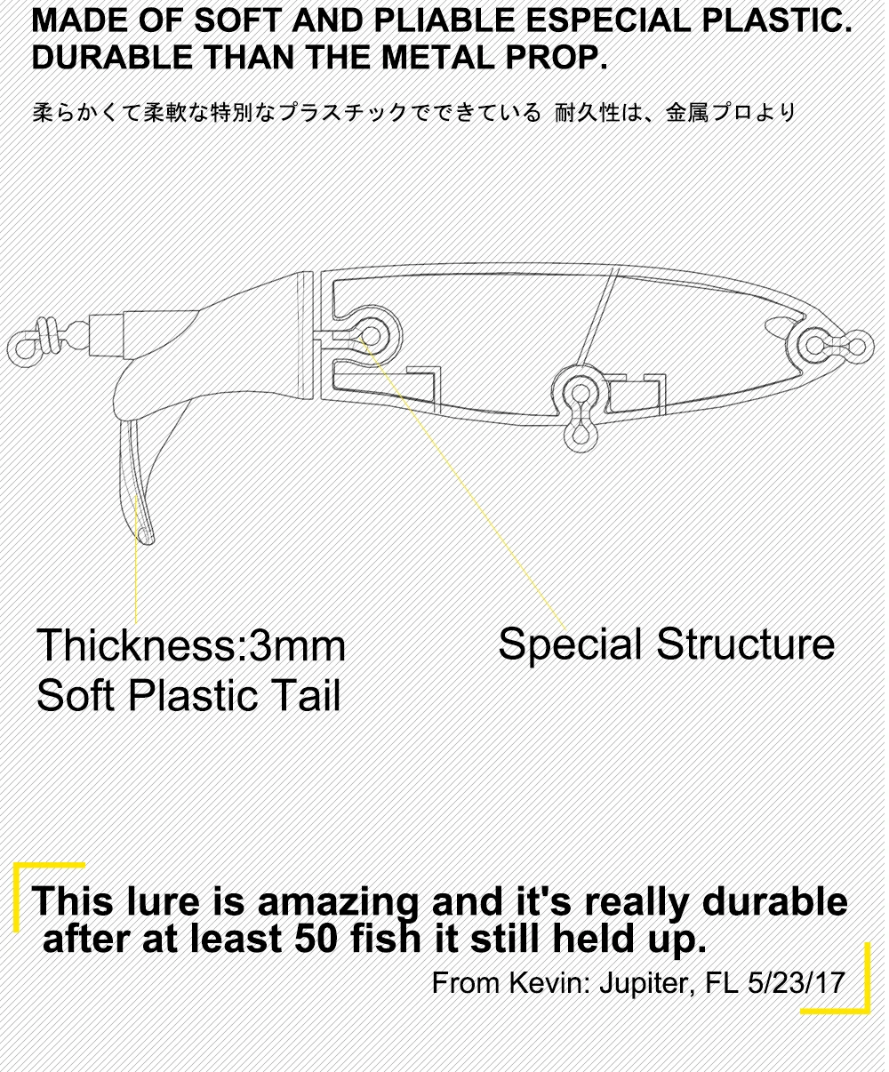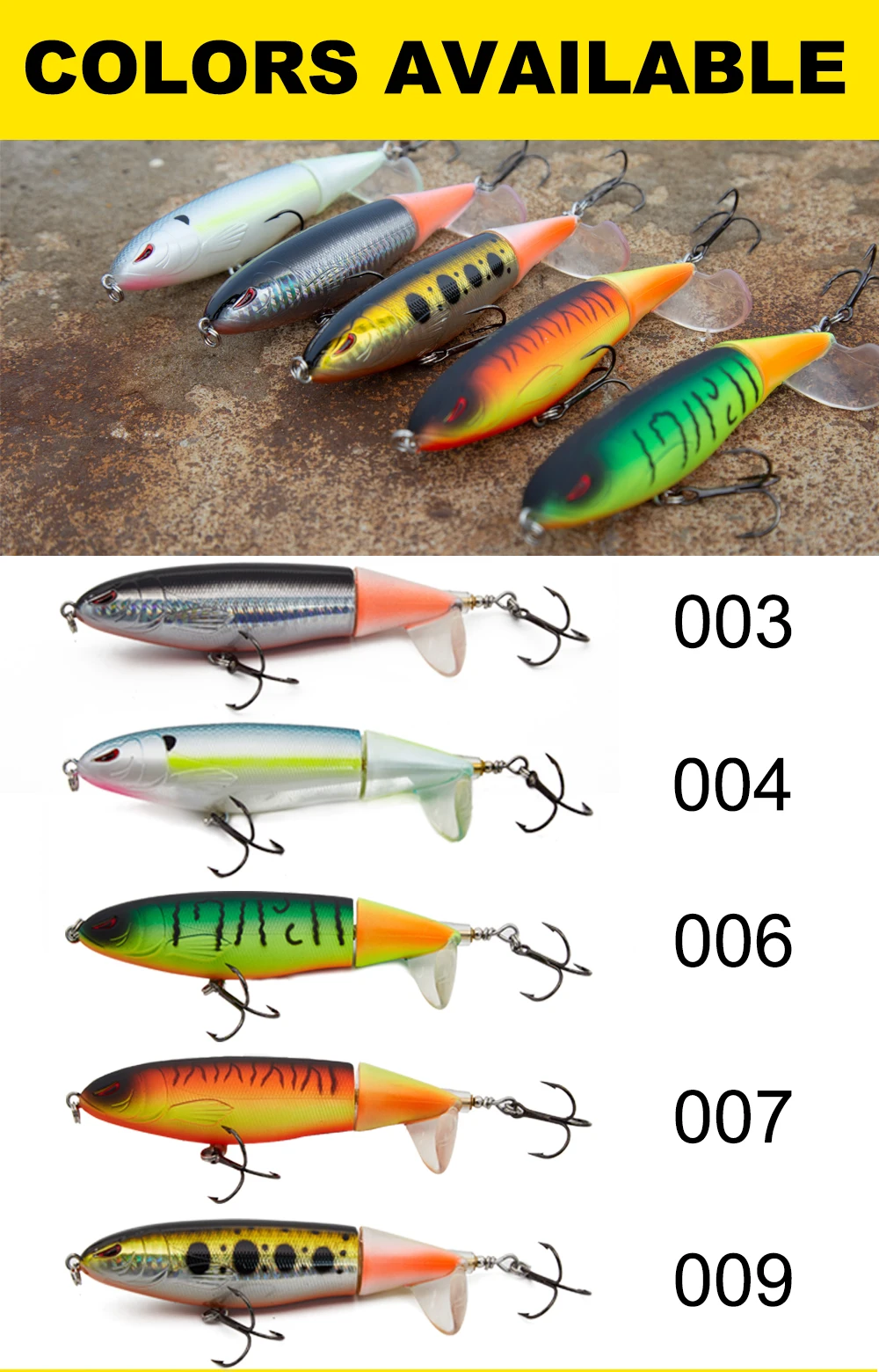 Longitud 100mmPeso 19gColor 6 coloresTipo lápiz y popperMaterial ABSCola única giratoria suavePosición Ocean Rock FshingCaracterísticas>1 、2. La lubina saltará literalmente hasta tres feetout del agua para golpear este cebo.3. Hecho de plástico suave y flexible especial, duradero que el accesorio de metal.