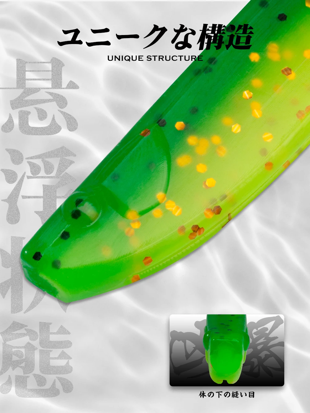 Hay una costura debajo del cebo blando, que puede ocultar el anzuelo, haciéndolo más realista en el agua.