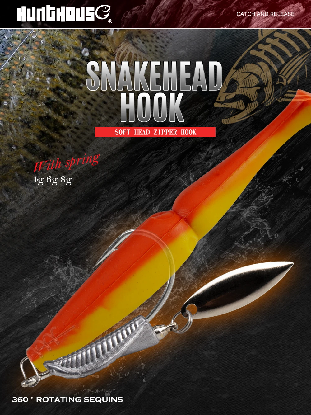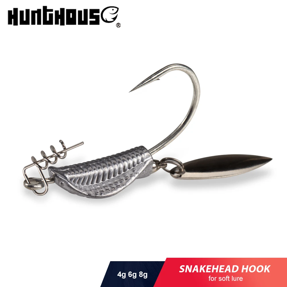 Tornillo de pesca de Hunthouse, gancho de cabeza de serpiente, cabeza de plantilla de Metal, 4g, 6g, 8g, almizcle para señuelo suave, Shad giratorio, agua salada, Lucio, lubina, aparejos de pescado