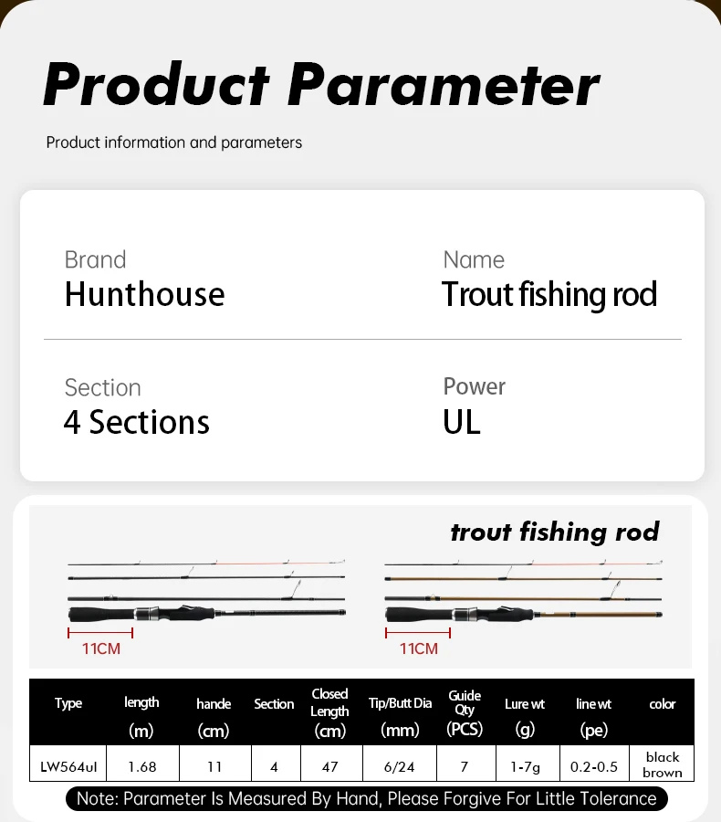 Caña de pescar de trucha Trave Hunthouse Spinning 4 secciones CL 47cm fibra de carbono 1,68m UL señuelo WT 1-7g para aparejos de peces de río de arroyo