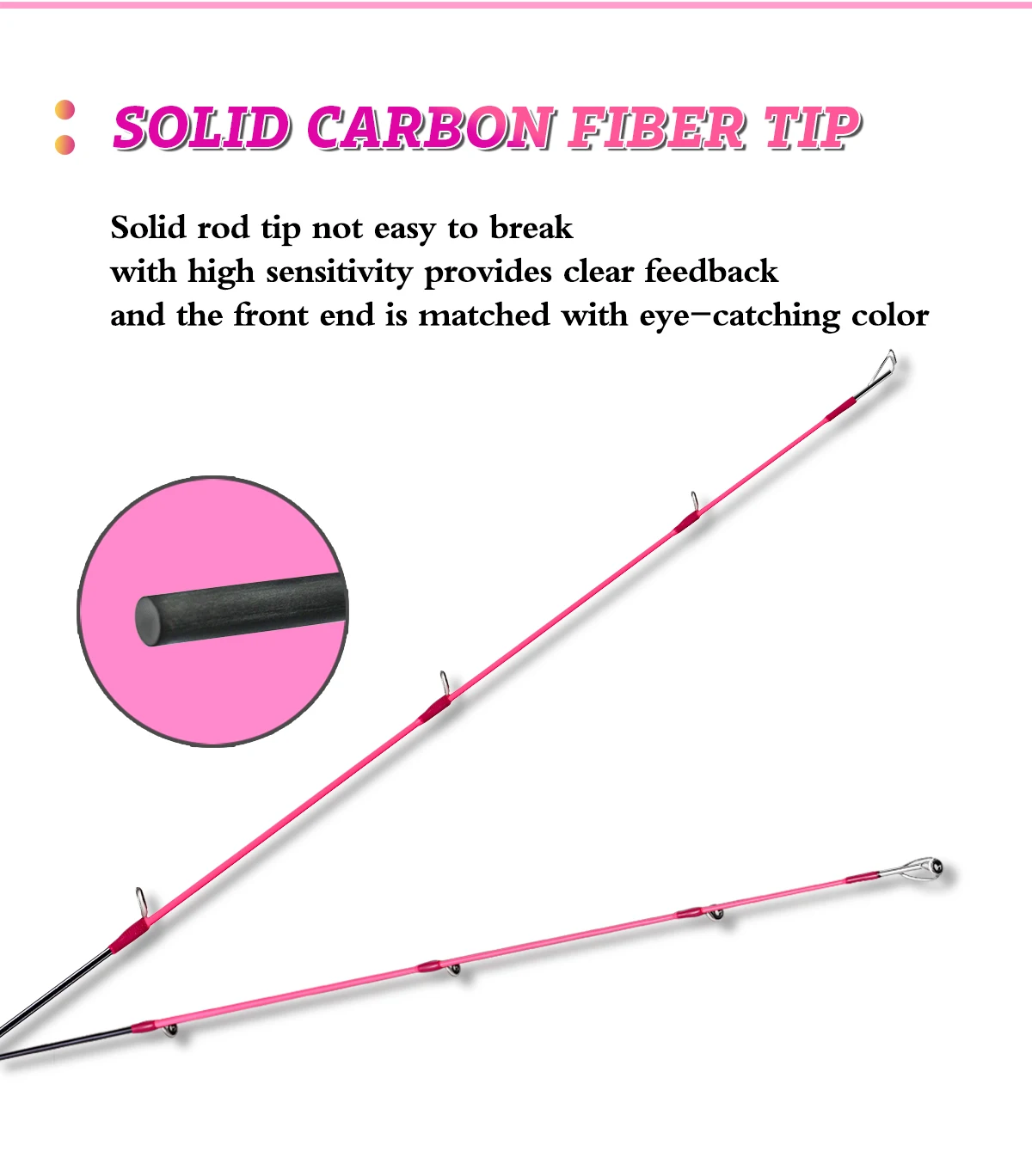 Material de alto carbono, peso súper ligero, Punta sólida, acción rápida. Adecuado para atrapar peces pequeños o de menos de 10 libras de tamaño mediano.