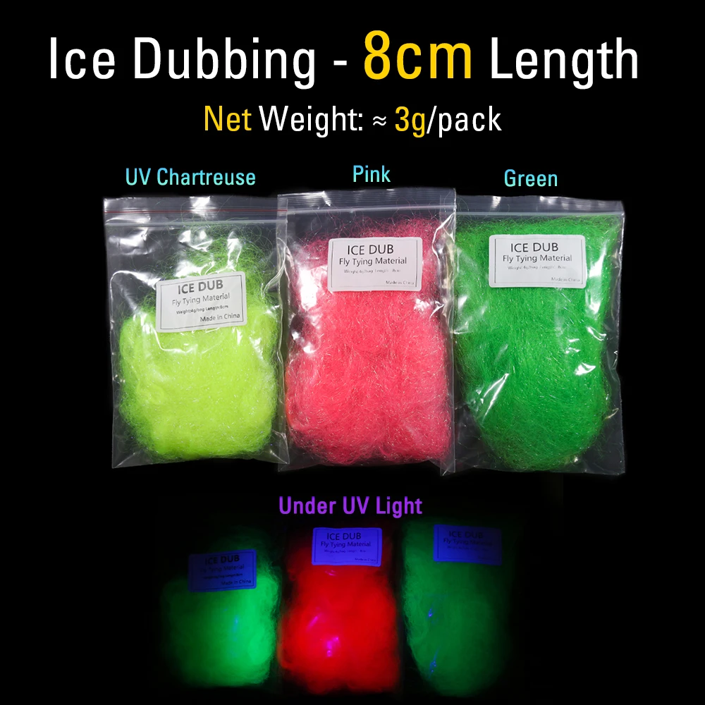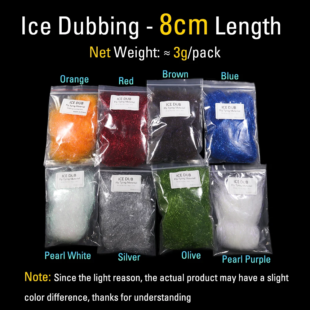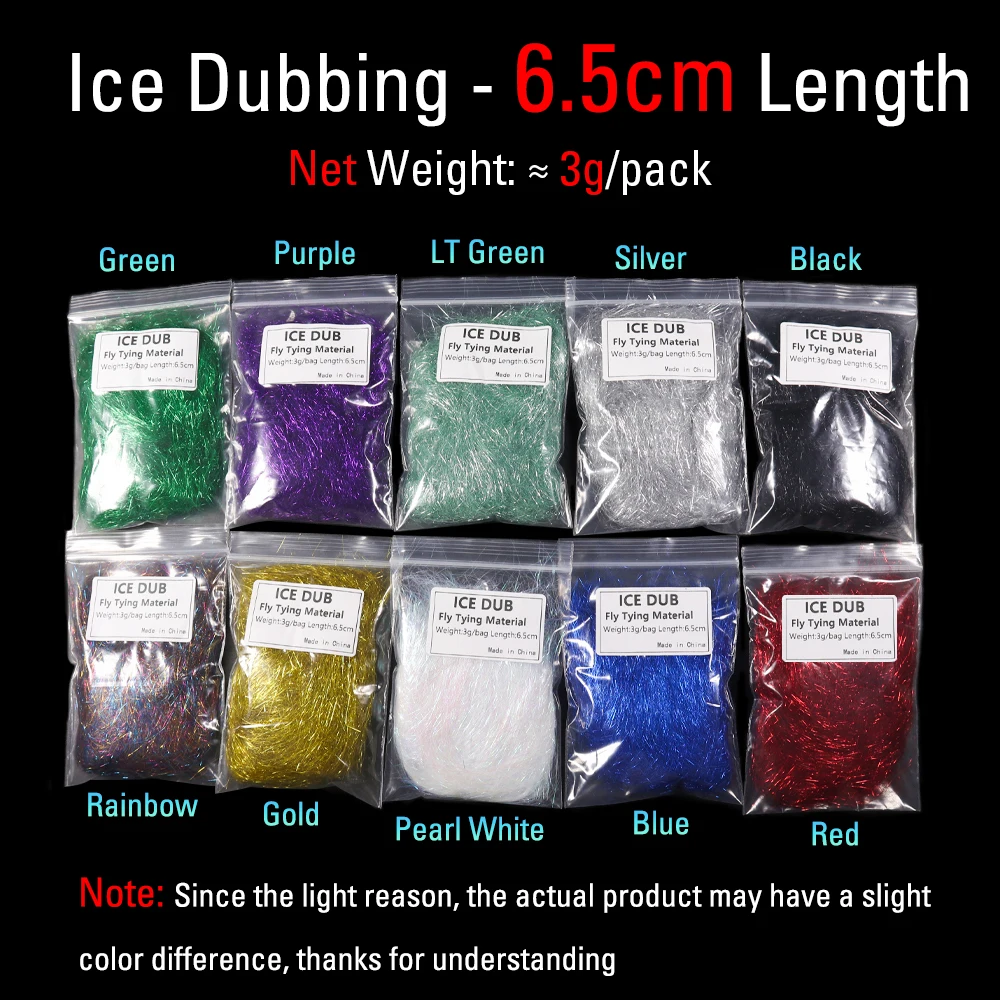 Ice Dub fly tying dubbing has a brilliant sparkle underwater and dubs beautifully. Special Ice Dub holographic provide any fly with extra sparkle. It belongs in every fly tyers’ arsenal for the simple reason that it can be used in just about everything. This dubbing material is extremely easy to work with, adds sparkle to any pattern, and comes in wide variety of colors. Great For trout flies, salmon flies, steelhead flies, catfish flies, bonefish flies ,and carp flies,etc...