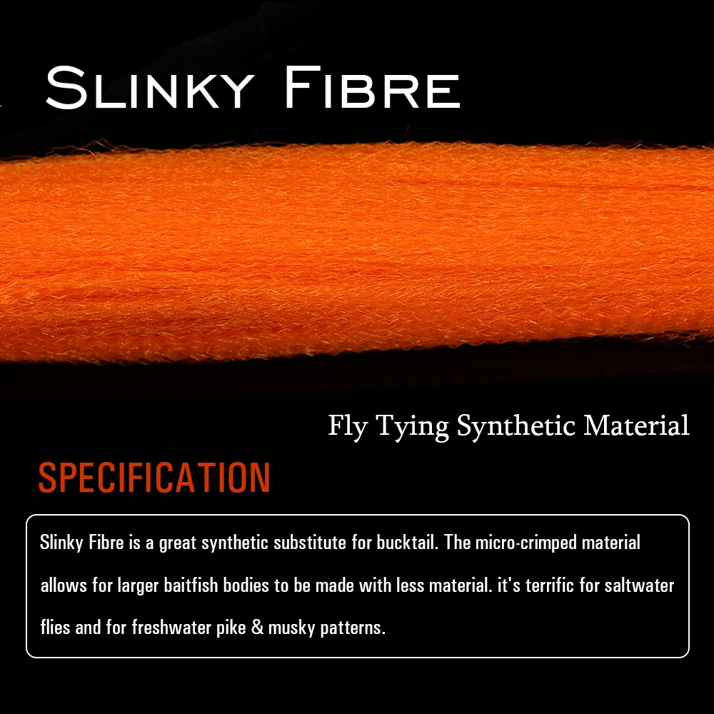 Slinky Fiber es un excelente sustituto sintético de Bucktail.El material microengarzado permite elaborar cuerpos de peces de cebo más grandes con menos material.Es fantástico para moscas de agua salada y para patrones de lucios y almizcleros de agua dulce.