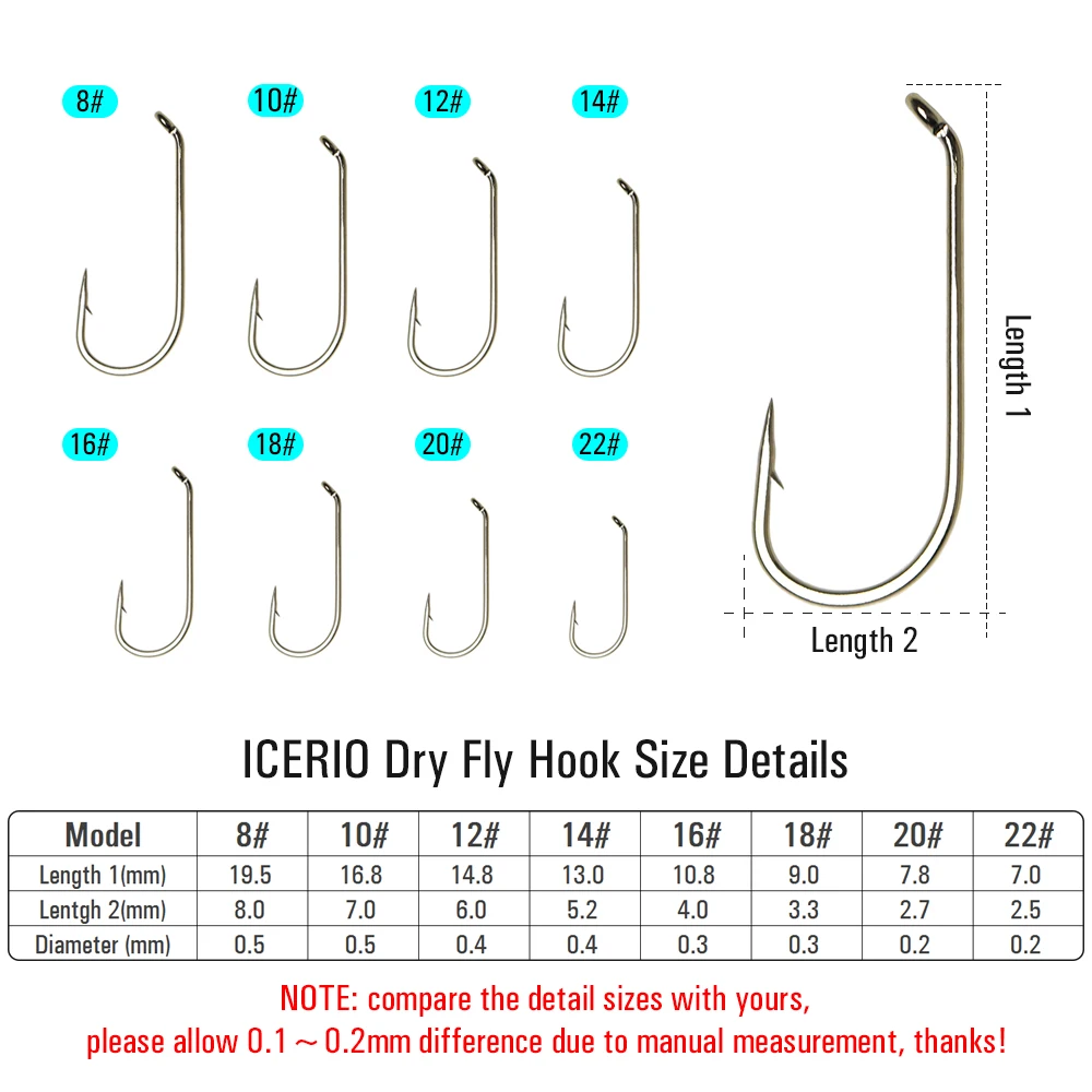 ICERIO 100 Uds ninfas seco y húmedo anzuelos para atar moscas ojo abajo 1X anzuelo de pesca de trucha con curvatura redonda de vástago largo