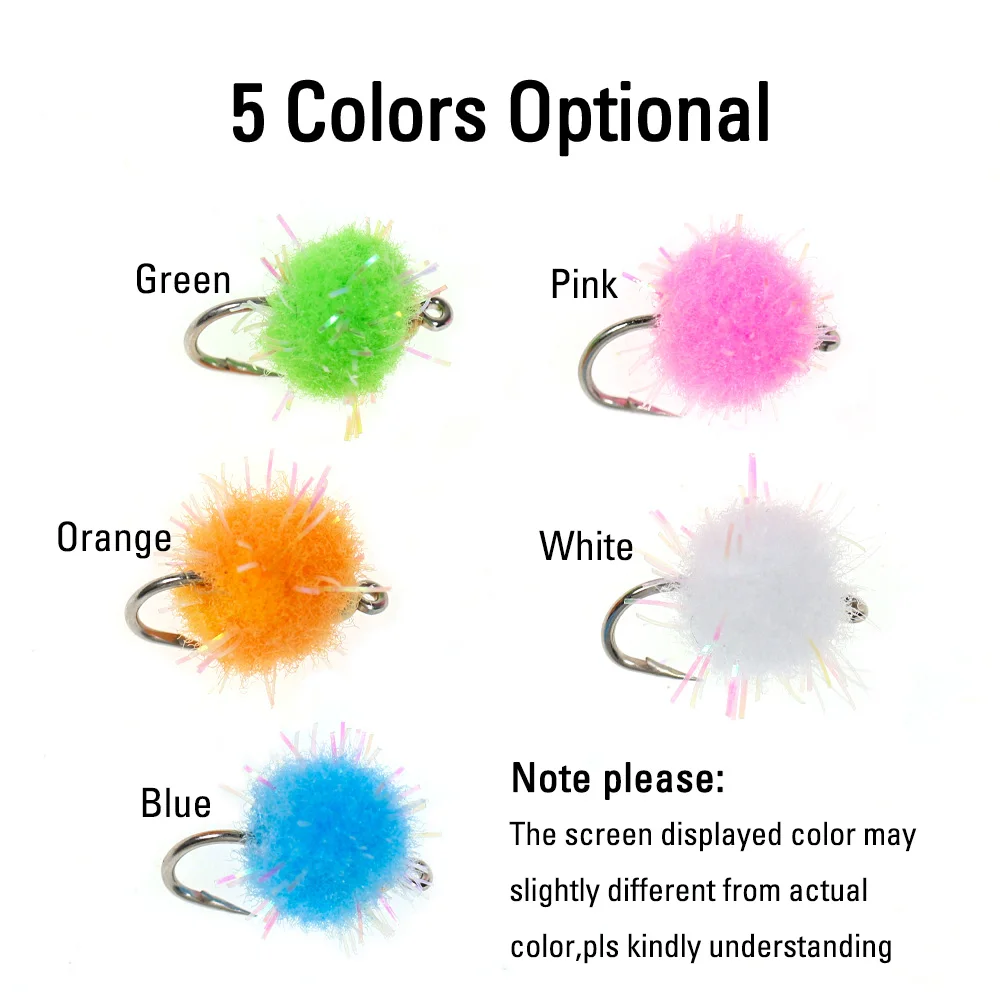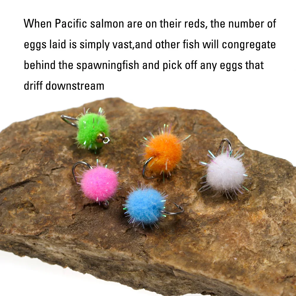 La mosca del huevo está atada para representar un huevo de salmón, una fuente de alimento para muchas especies de peces, incluidas la trucha arcoíris, el agua y el aseo.Cuando el salmón del Pacífico está en sus enrojecimientos, la cantidad de huevos colocados es simplemente vasta, y otros peces se acompañarán detrás de los peces voladores y recogerán los huevos que se bajen.