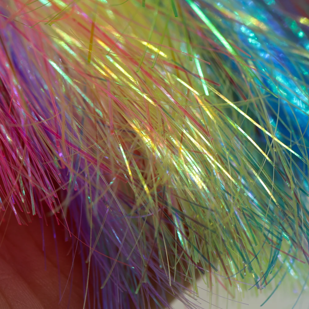 Cuando no quieras superar los patrones de serpentinas y los tipos de moscas Steelhead, prueba Micro Mirage Flashabou.Con 1/100 de pulgada Micro Opal Mirage Flashabou es fantástico cuando necesitas solo un poco de flash.También es excelente para nervaduras en entradas, cuerpos intermedios y más.