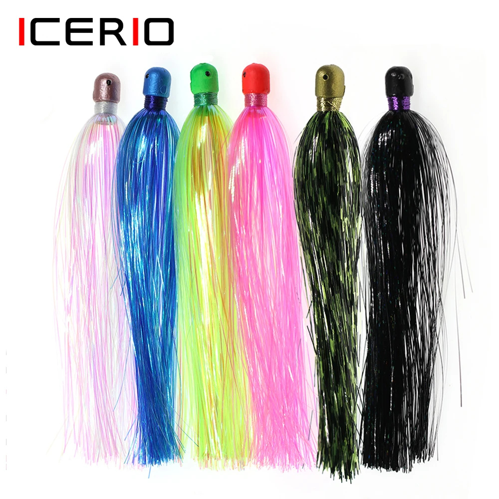 ICERIO Mylar Flash Teaser Tail Jig Head Señuelo de pesca Cebo para pesca en agua salada Bullet Head Flasher Fluke Falda Trolling Lure Rigs Accesorios