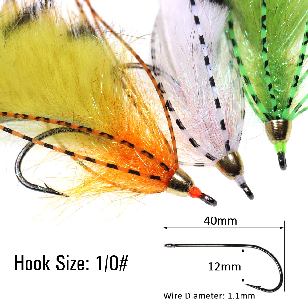 Los cabezales de cono de latón Barred Zonker Fly son un remolque de 3,5" que imita una pequeña merda. Es uno de nuestros favoritos para los marrons grandes, las truchas toro y el lubina de boca pequeña. Se hunde rápido gracias al cabezal cónico de latón. ¡La articulación también le da un montón de movimiento realista en el agua! Color: Amarillo barrado, Verde barrado, Blanco barrado. Tamaño del gancho: 1/0 # Longitud: aproximadamente 3,5''(≈10 cm) Unidad de embalaje: 3 unidades/caja Vuelo Especies objetivo típicas: trucha, lubina, salmón, etc.